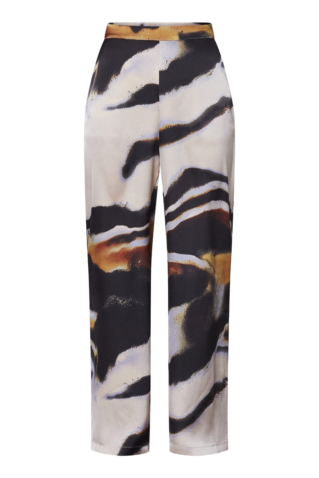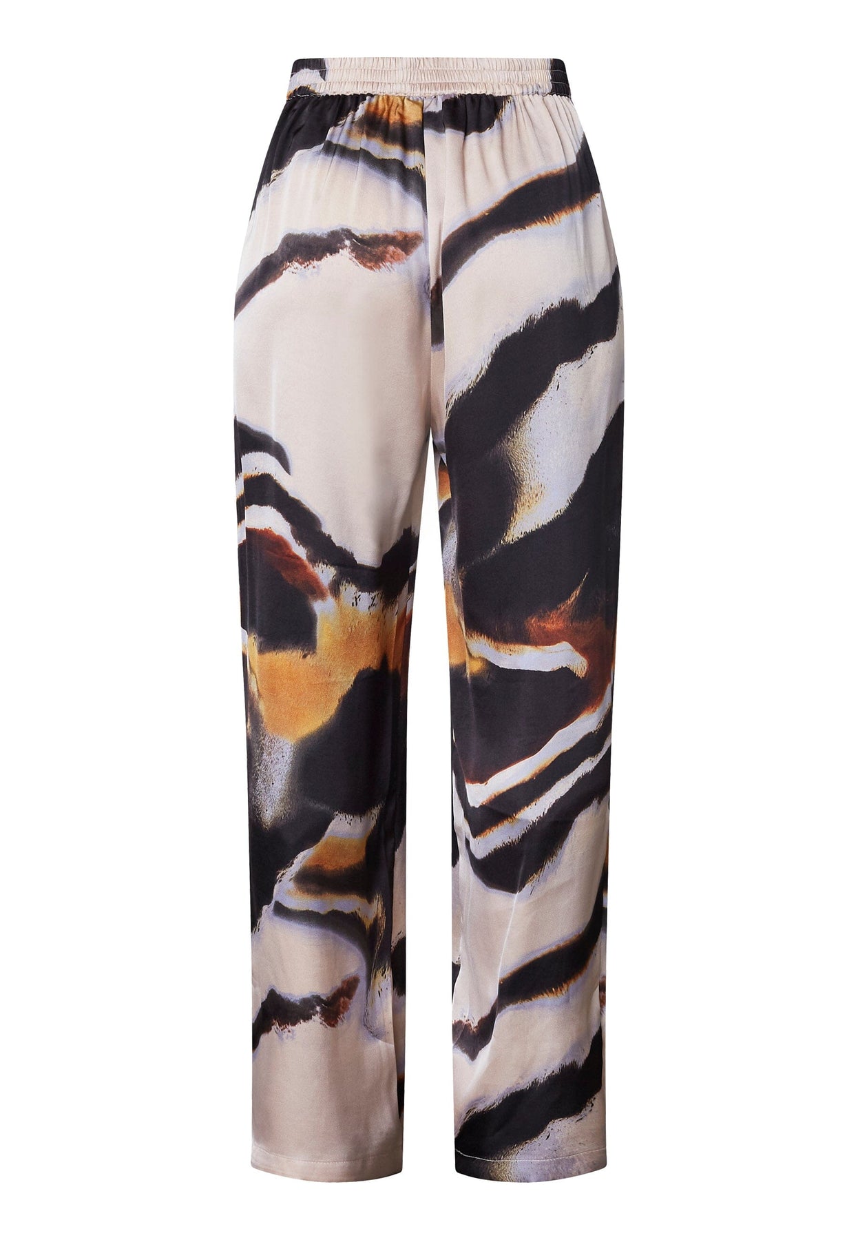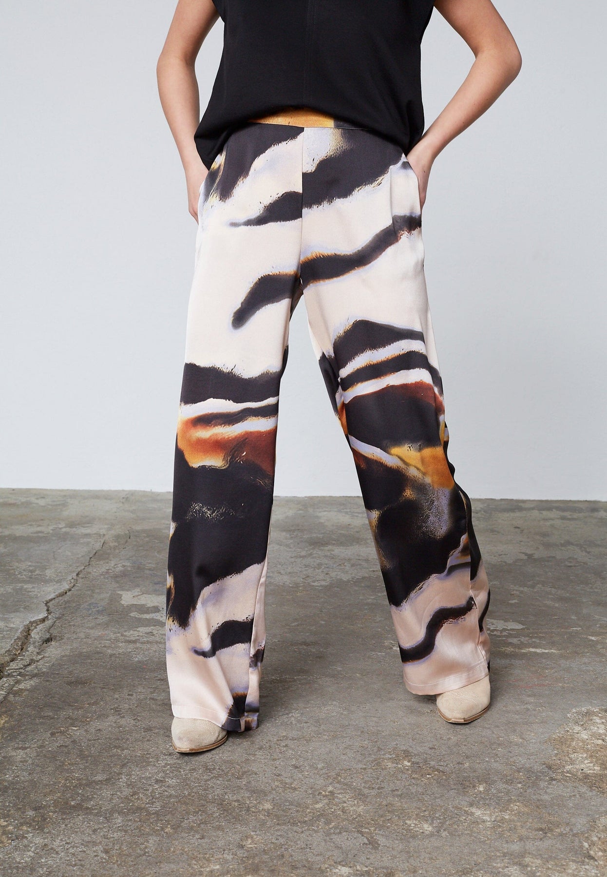 Bukser fra Love & Divine med et abstrakt mønster i beige, sort og orange nuancer. Den høje talje og vide benstil giver en afslappet silhuet, mens den elastiske lukning sikrer en god pasform.