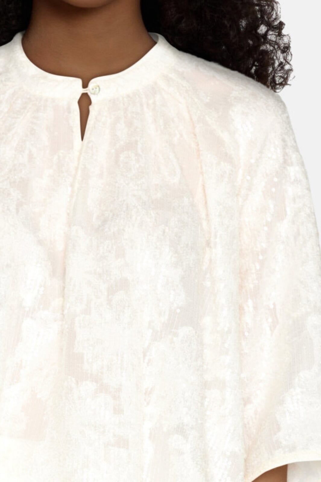 Sød ensfarvet bluse, med et dekorativt mønster. Blusen har kina krave, med en lille knap. Blusen er løstsiddende, og har korte ærmer.