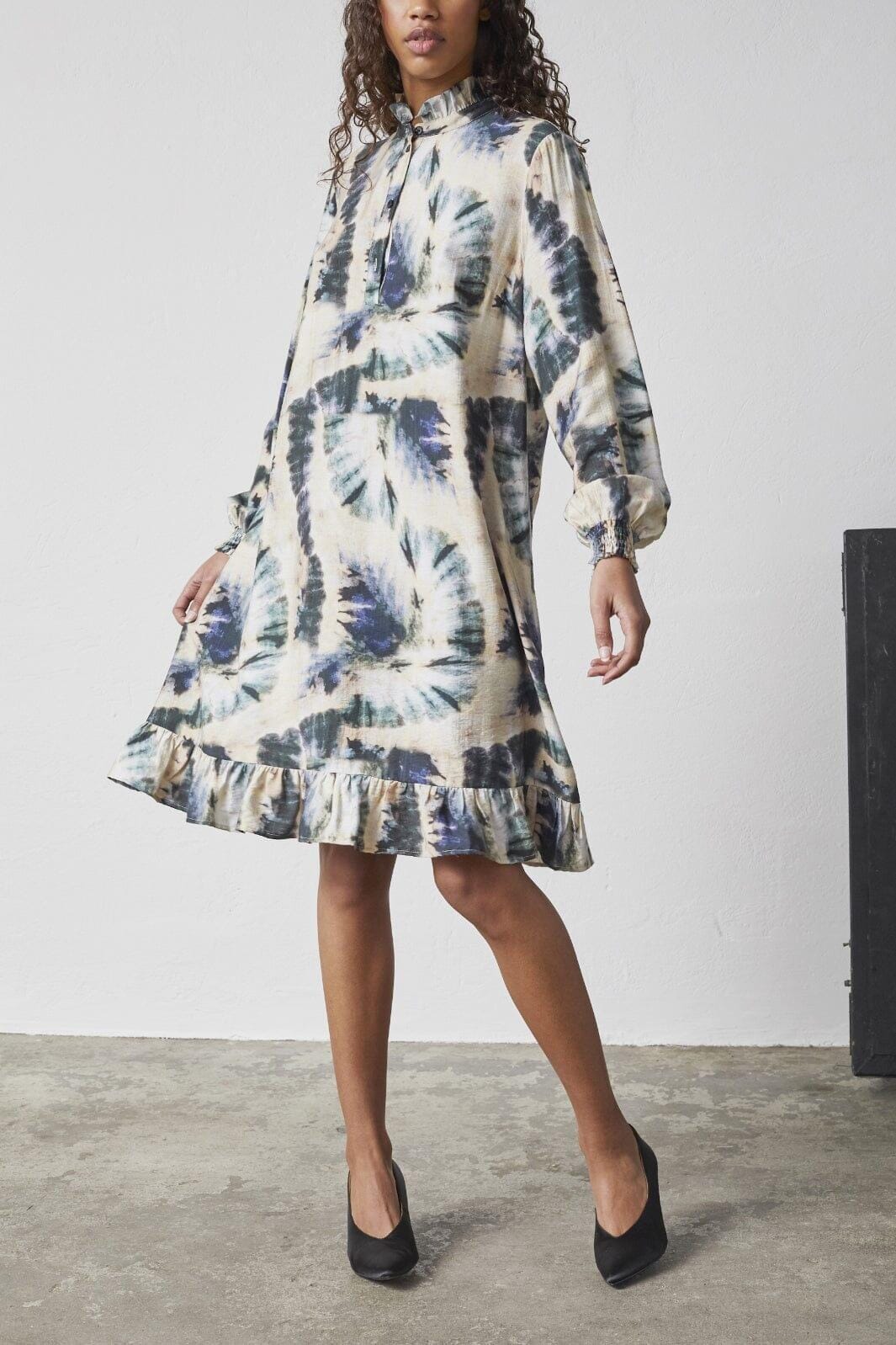 Kjole fra Love & Divine med tie-dye mønster i beige, grøn og blå nuancer. Den har høj hals, knapdetaljer foran og en rynket kant forneden. De lange ærmer samles ved håndleddene.