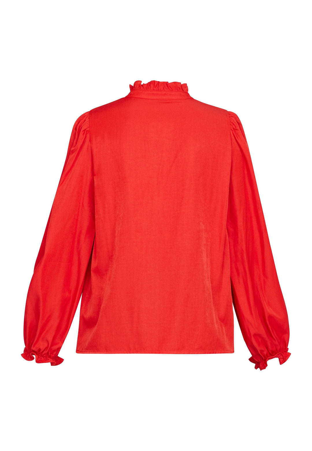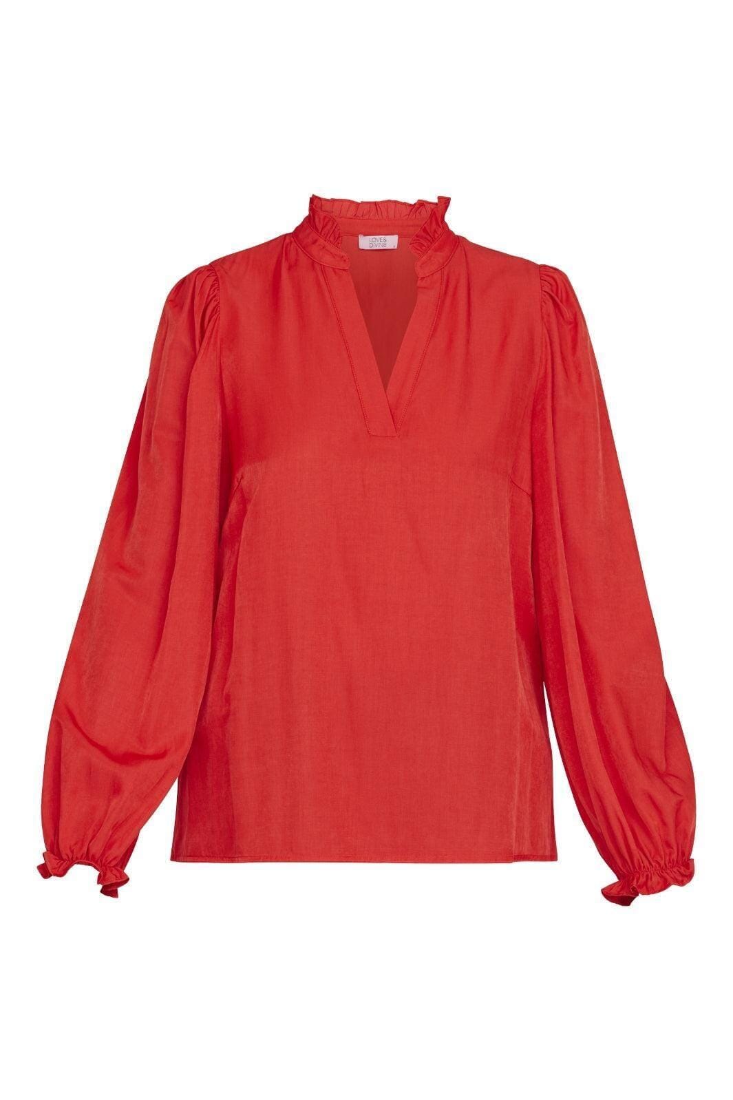 Rød bluse fra Love & Divine med rynket krave og pufærmer. Blusen har en v-udskæring og flæsedetaljer ved skuldrene, der skaber et feminint udtryk.