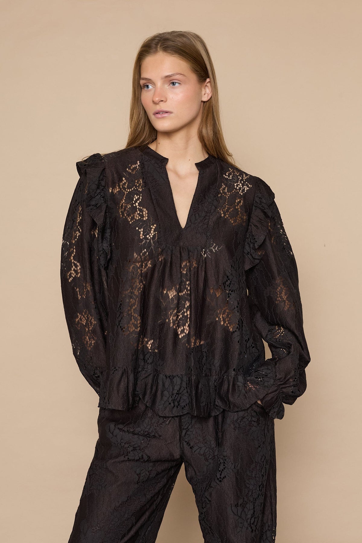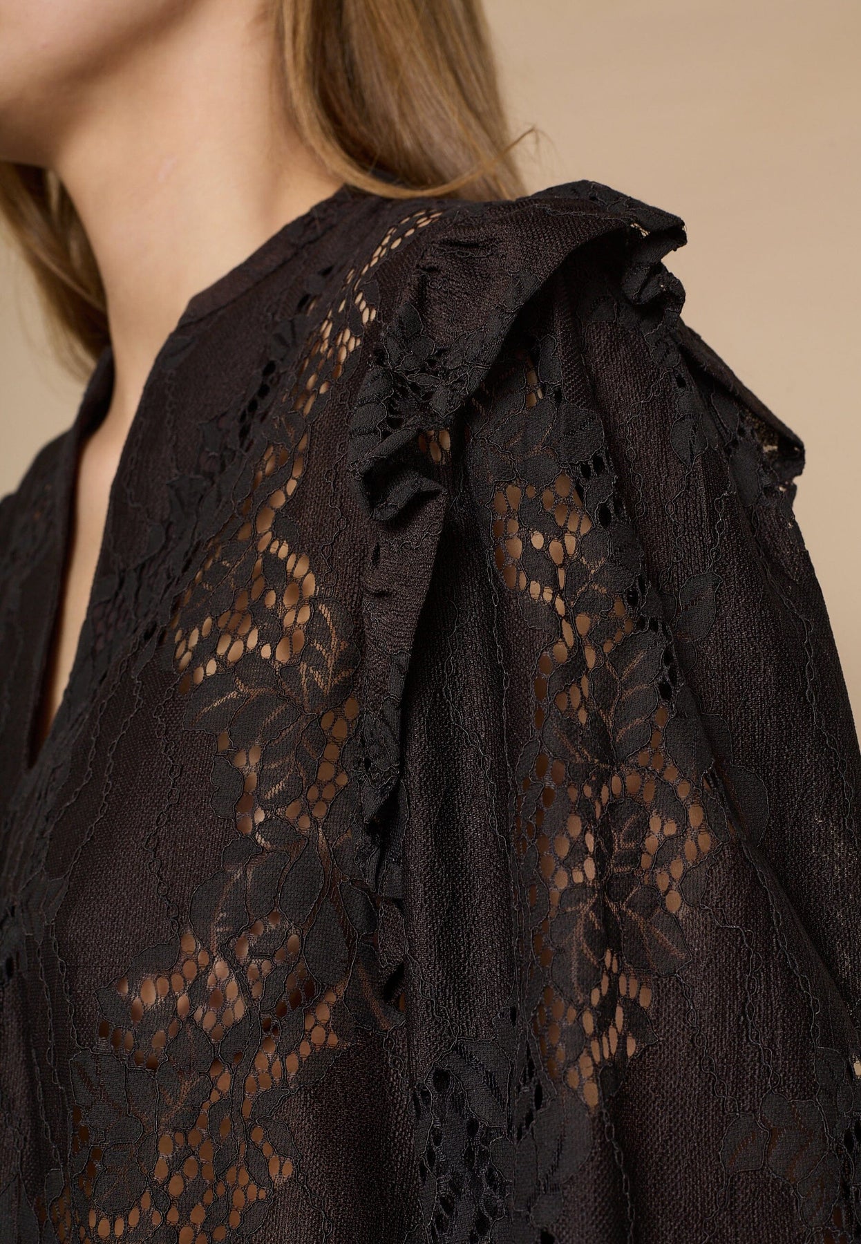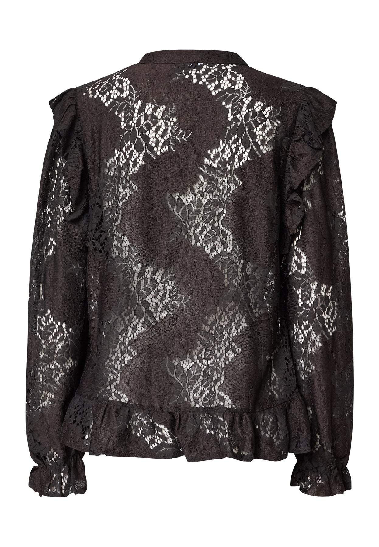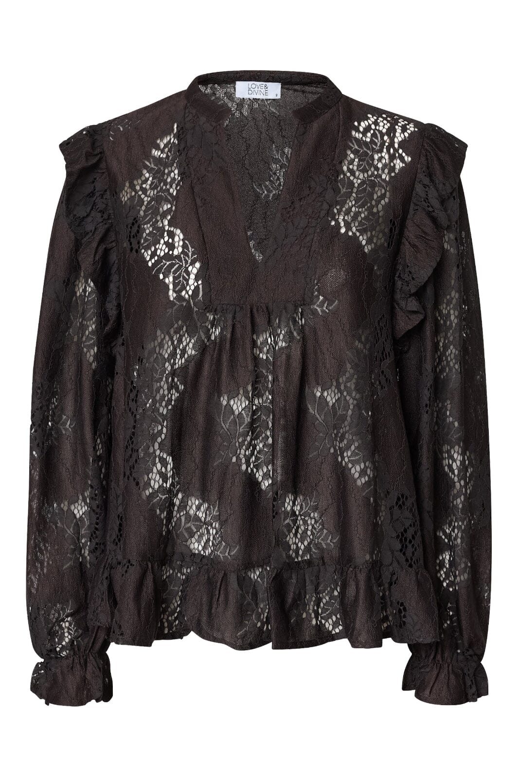 Bluse fra Love & Divine i mørk chokoladebrun med gennemsigtigt, blomstret blondemønster. Blusen har flæsedetaljer ved skuldrene og manchetterne.