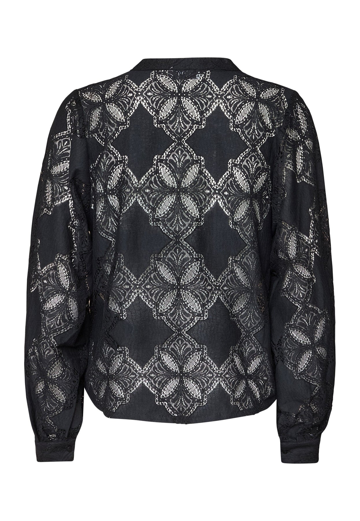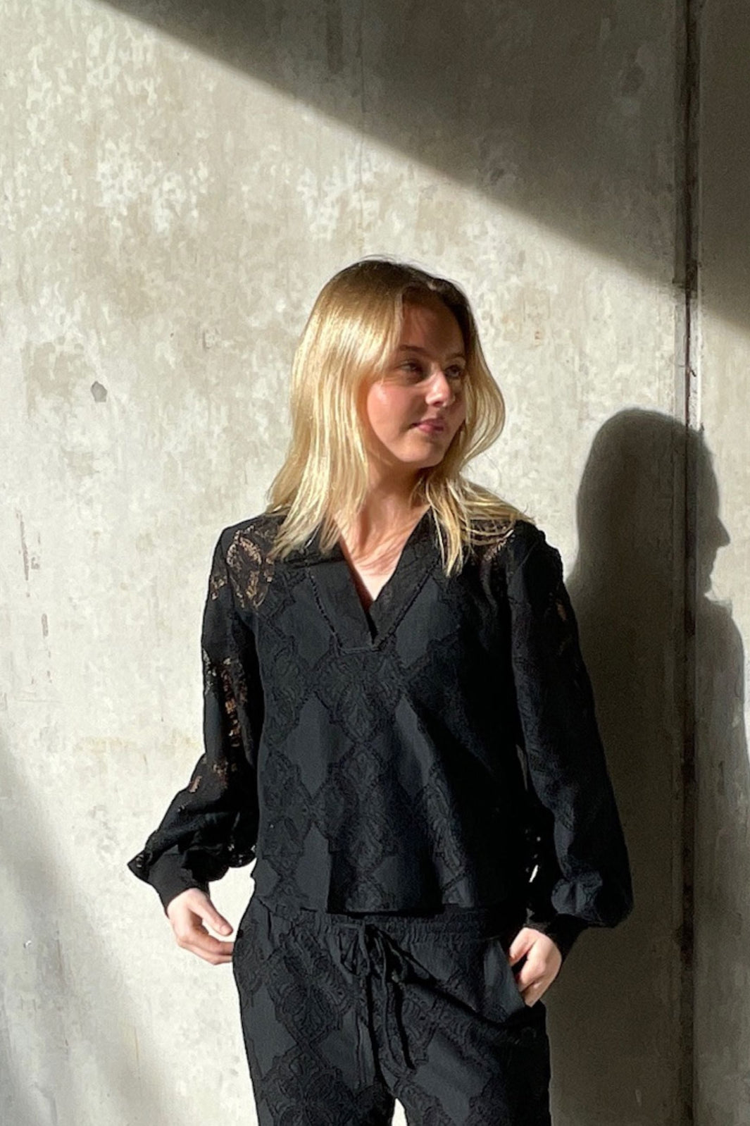 Sort bluse fra Love & Divine med gennemgående blondemønster. Blusen har en dyb V-udskæring og lange, let puffede ærmer med manchetter.