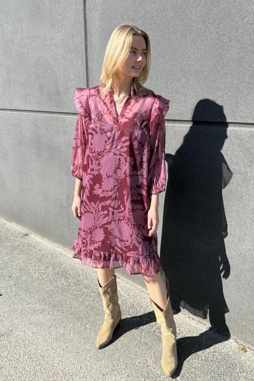 Kjole fra Love & Divine med blomsterprint i blush- og burgunder nuancer. Den har V-hals, 3/4 ærmer og rynkede detaljer ved ærmerne og kanten.