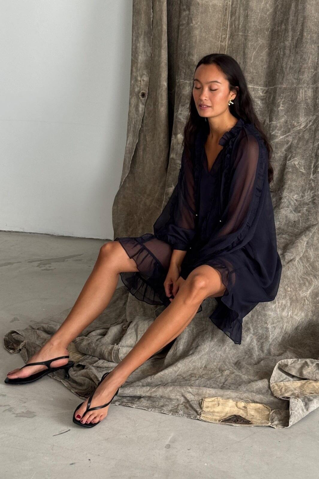 Navy kjole fra Love & Divine med flæsedetaljer. Kjolen har høj hals med bindebånd, lange ærmer og et let transparent stof med flæsekanter langs fronten og ærmerne.