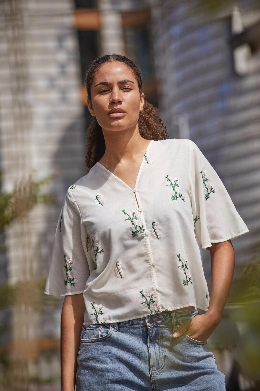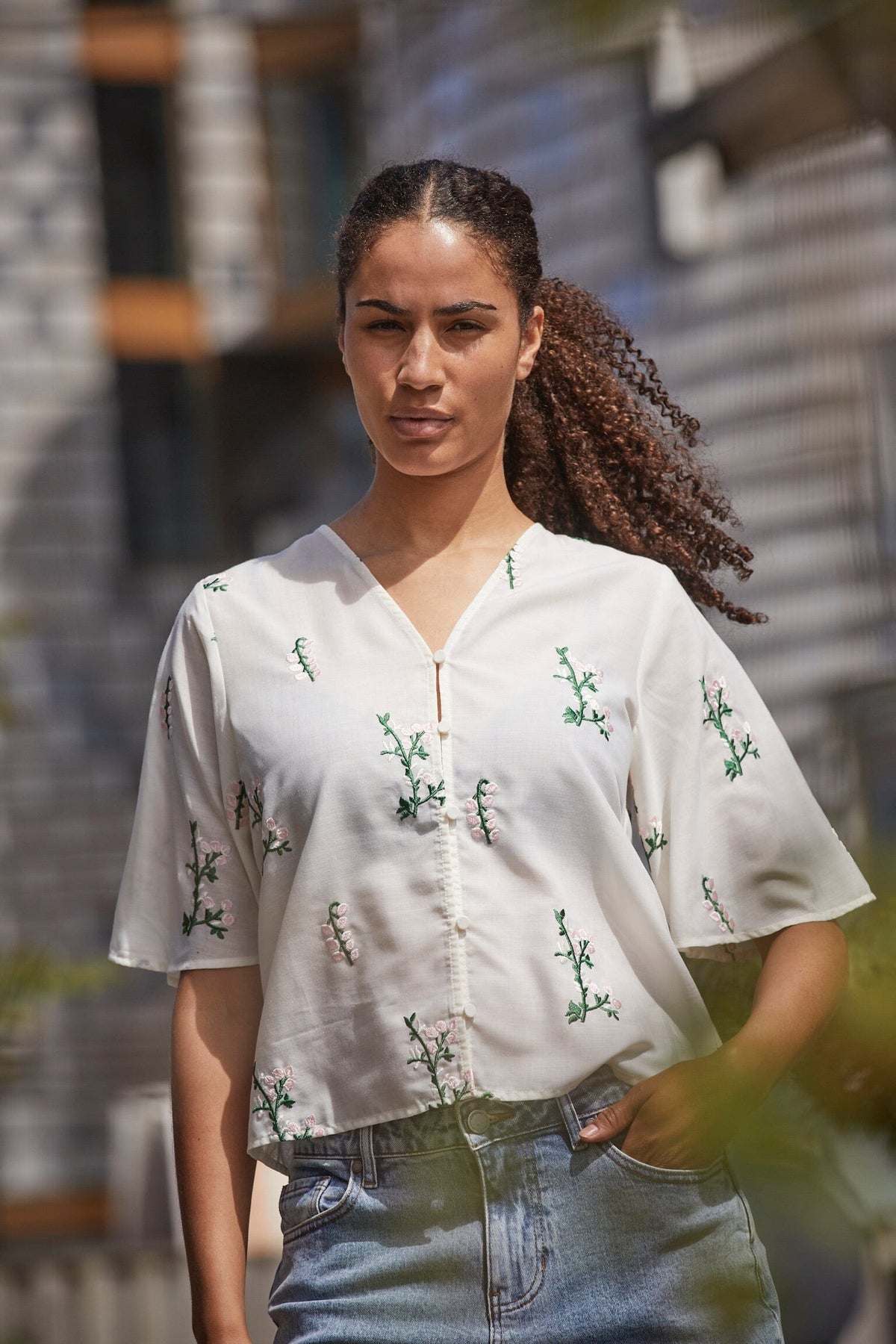 Cremefarvet bluse fra Love & Divine med broderede blomster i lyserød og grønne stilke. Blusen har en v-halsudskæring, knaplukning foran og brede, korte ærmer.