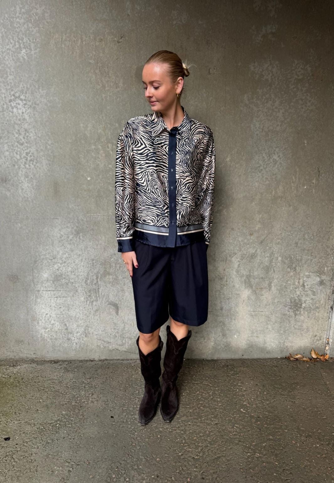 Skjorte fra Love & Divine med zebraprint i mørkeblå og beige nuancer. Skjorten har en klassisk krave og knaplukning ned langs fronten.