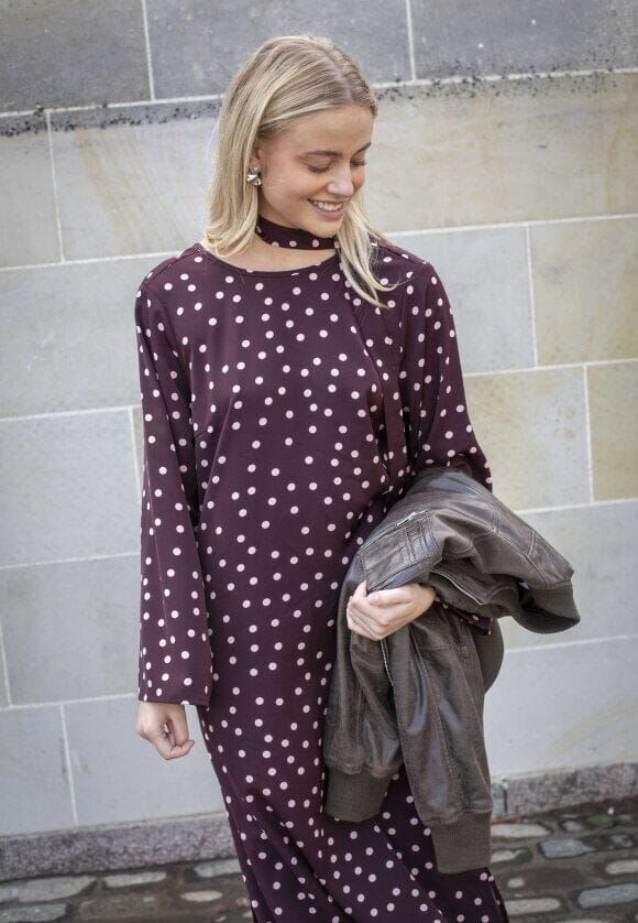 Langærmet kjole fra Love & Divine i bordeaux med lyse polkaprikker. Den lange kjole har en rund halsudskæring og en løs pasform med slids i siden.