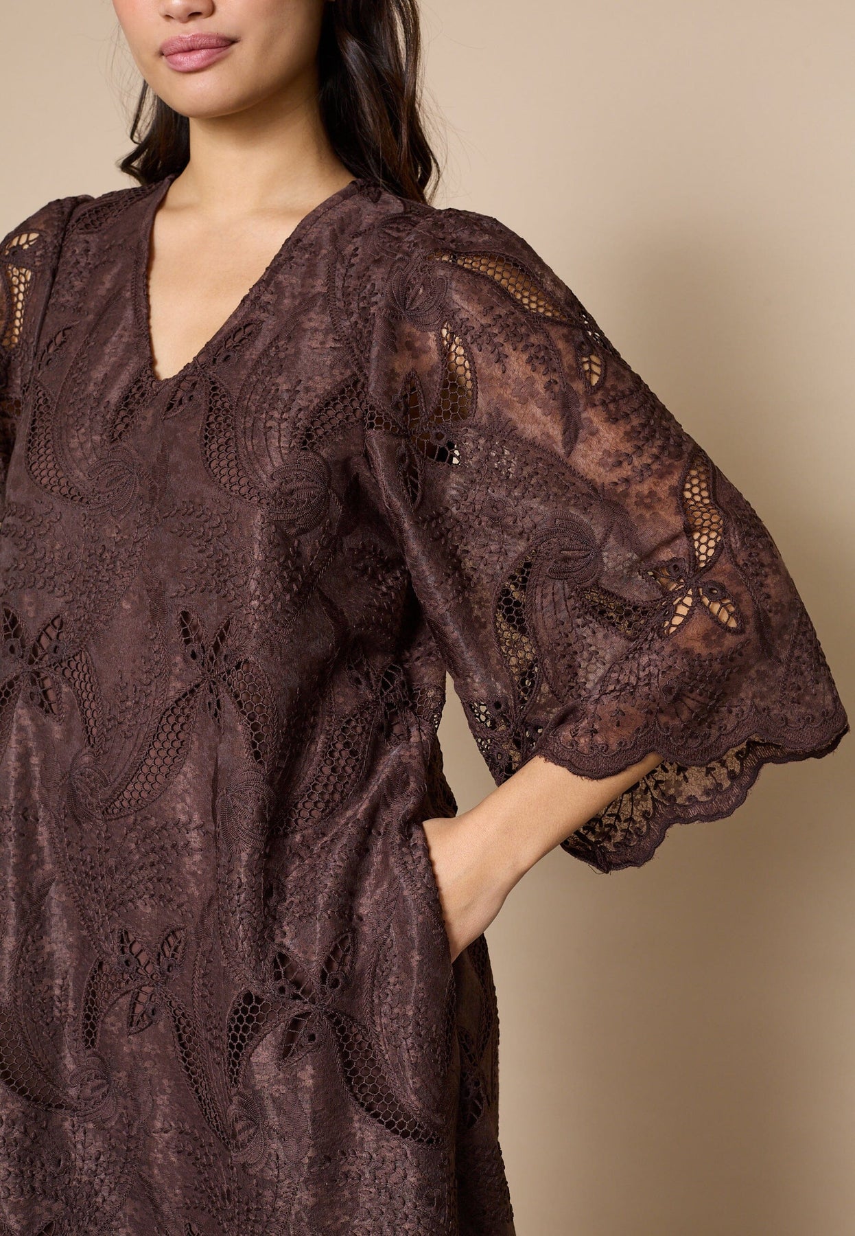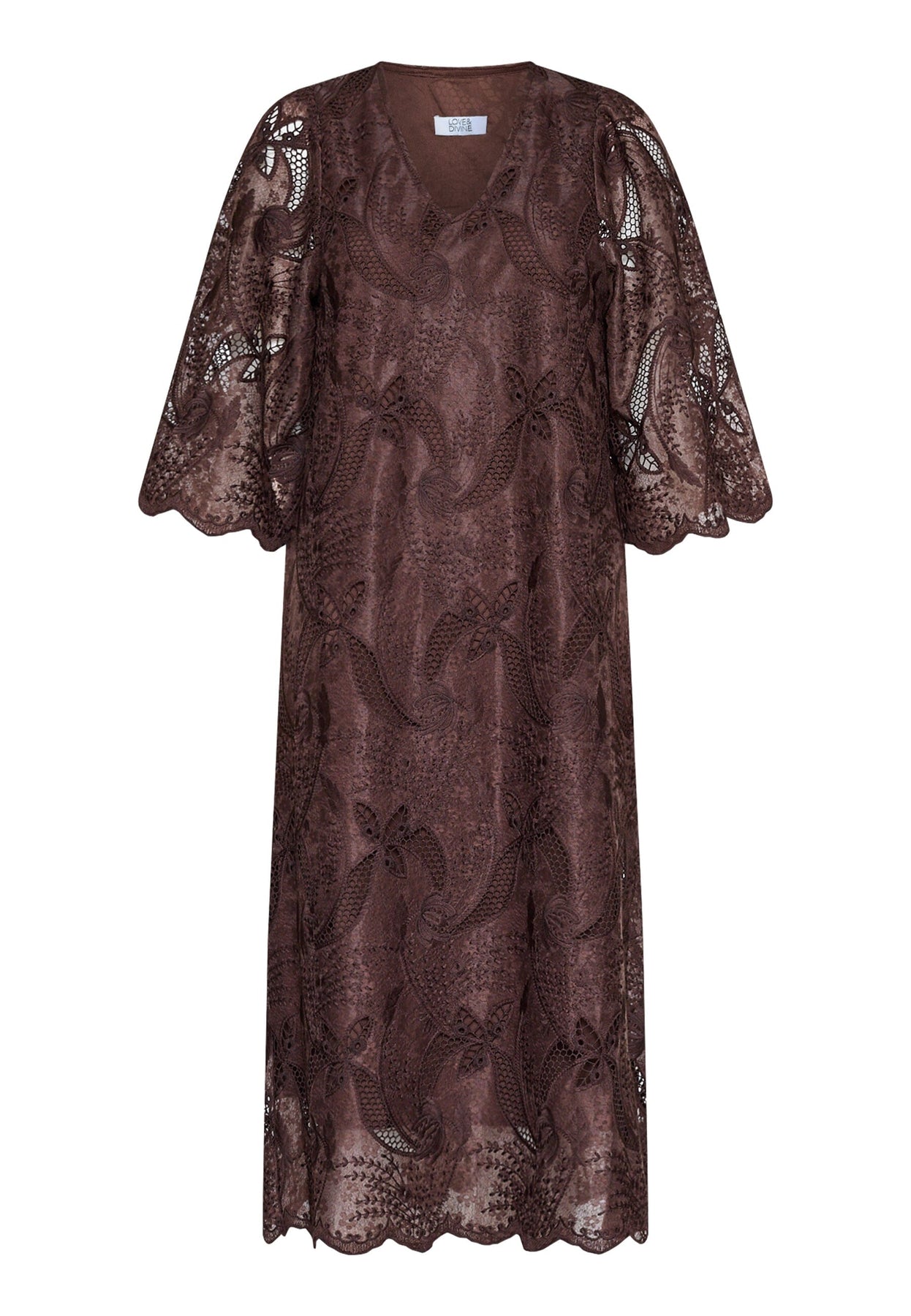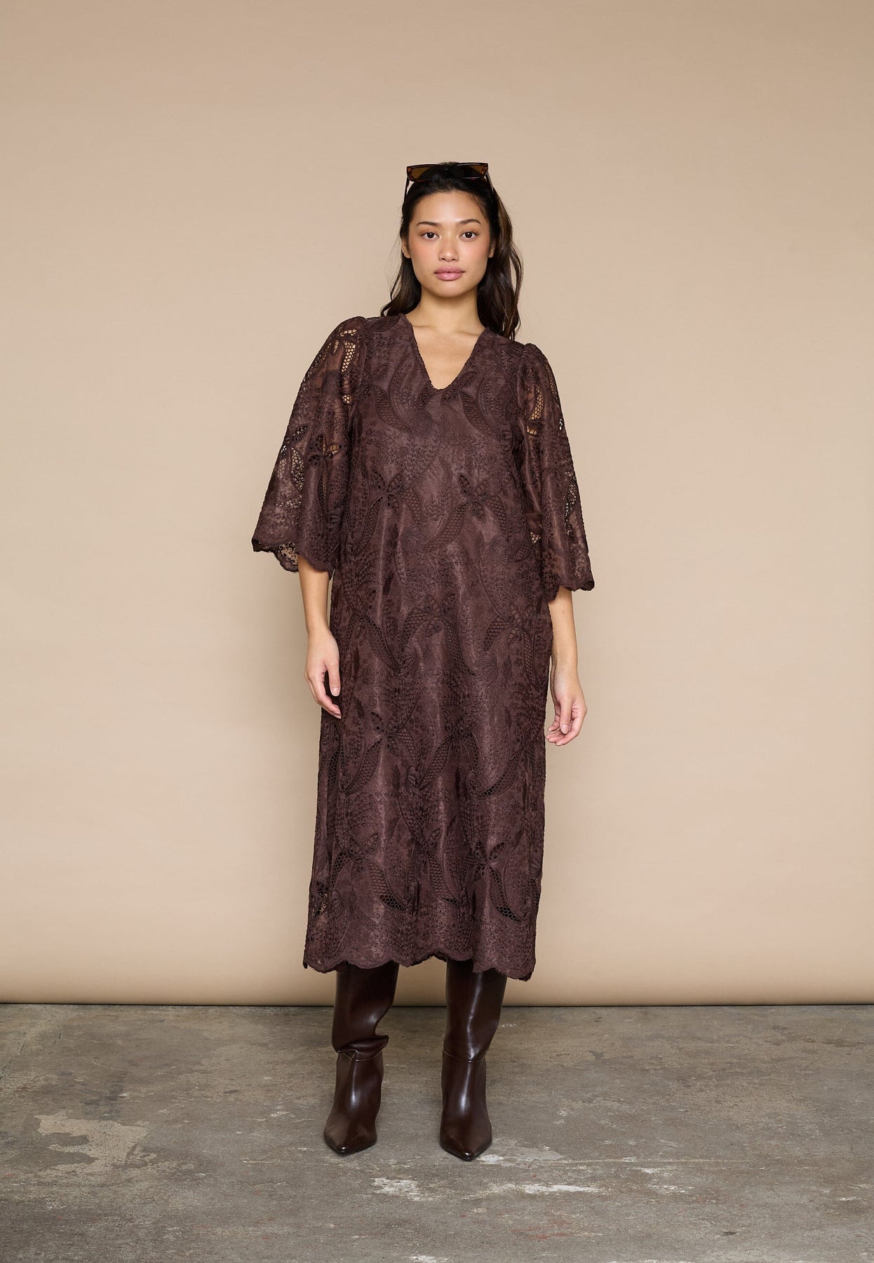 Brun kjole fra Love & Divine med broderi og blonde. Kjolen har trekvartlange ærmer, V-udskæring og et blomster- og paisleymønster.