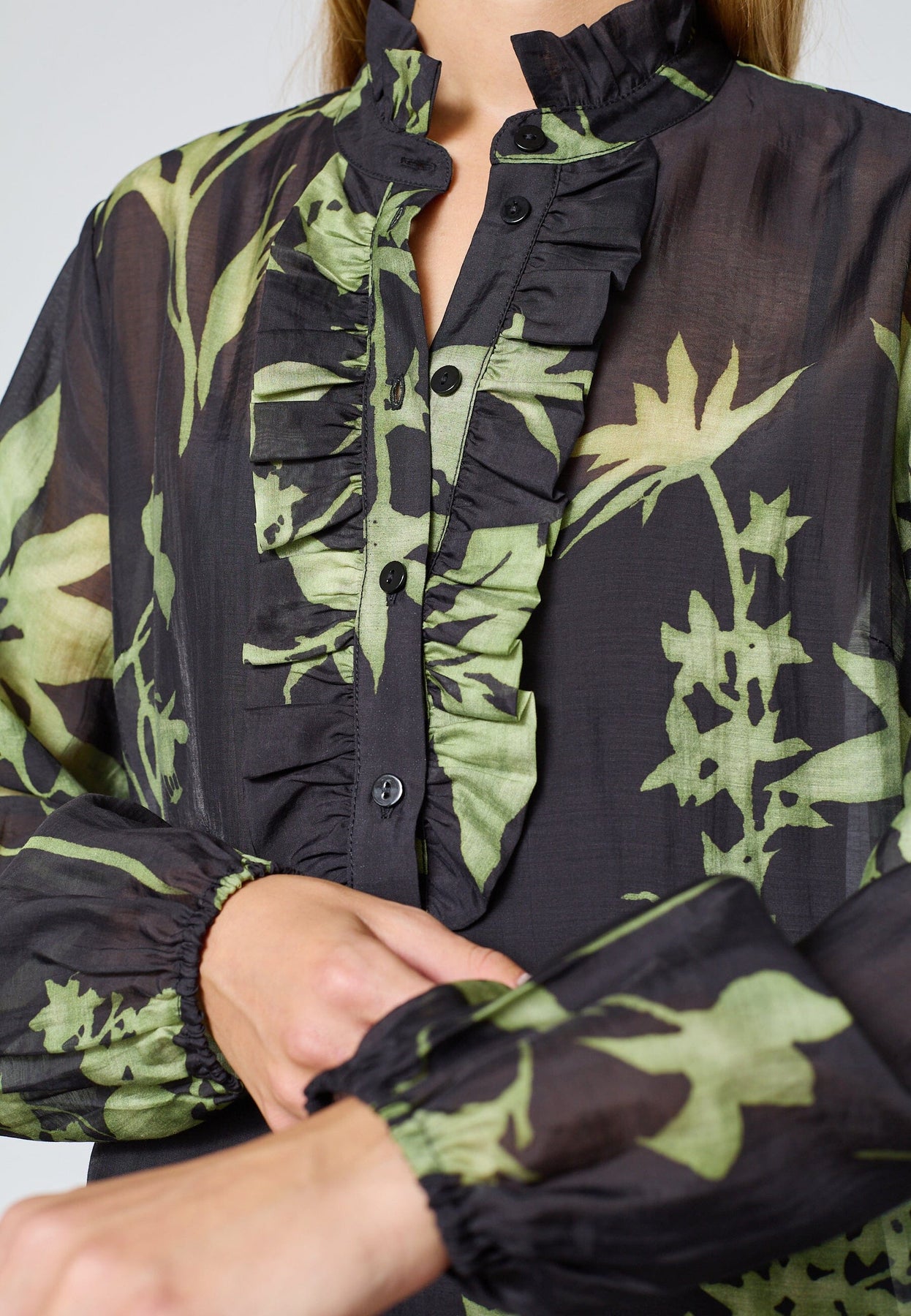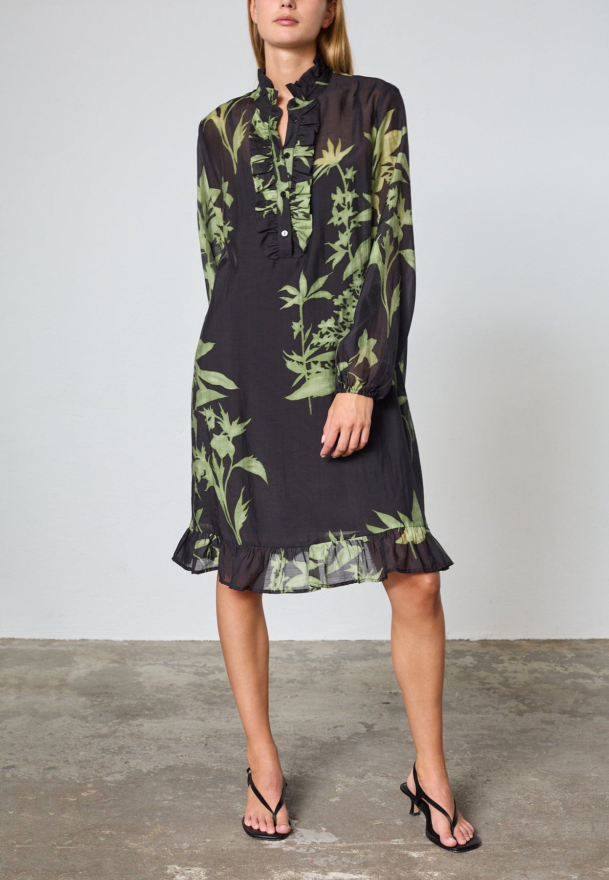 Knælang kjole fra Love & Divine med grønt bladmønster på mørk baggrund. Kjolen har en lille stående krave med flæser og lukkes med knapper.