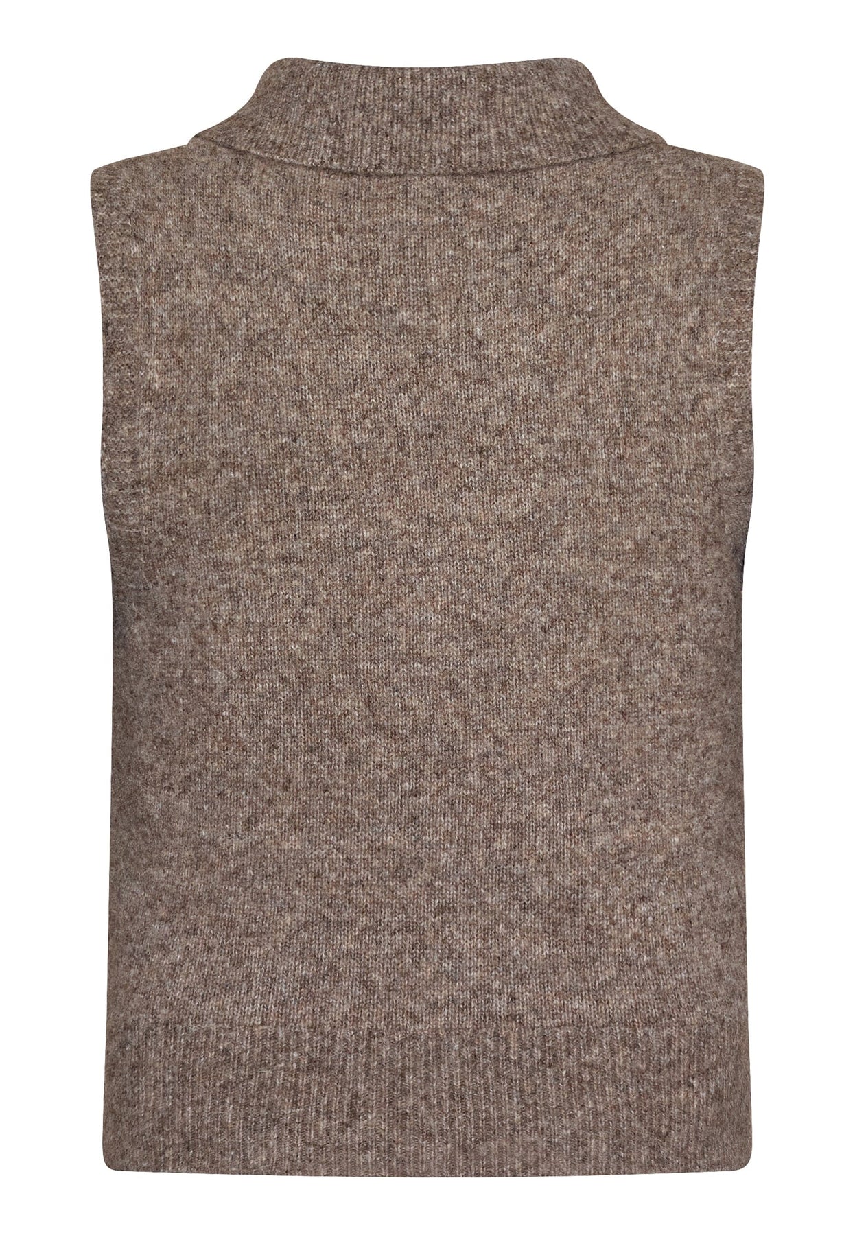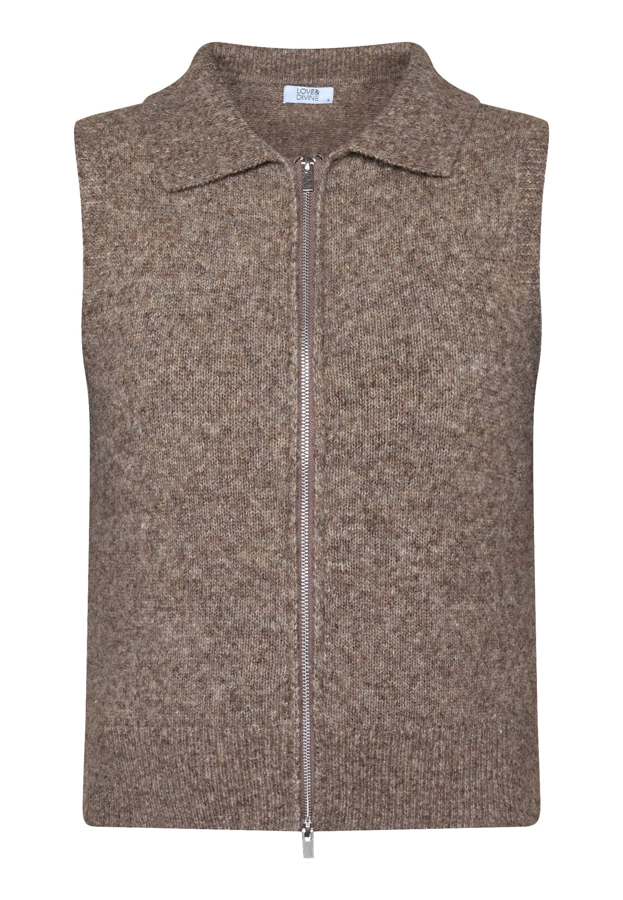 Ærmeløs strikvest fra Love & Divine i brun meleret farve. Vesten har en polokrave og fuldlængde lynlås i front.