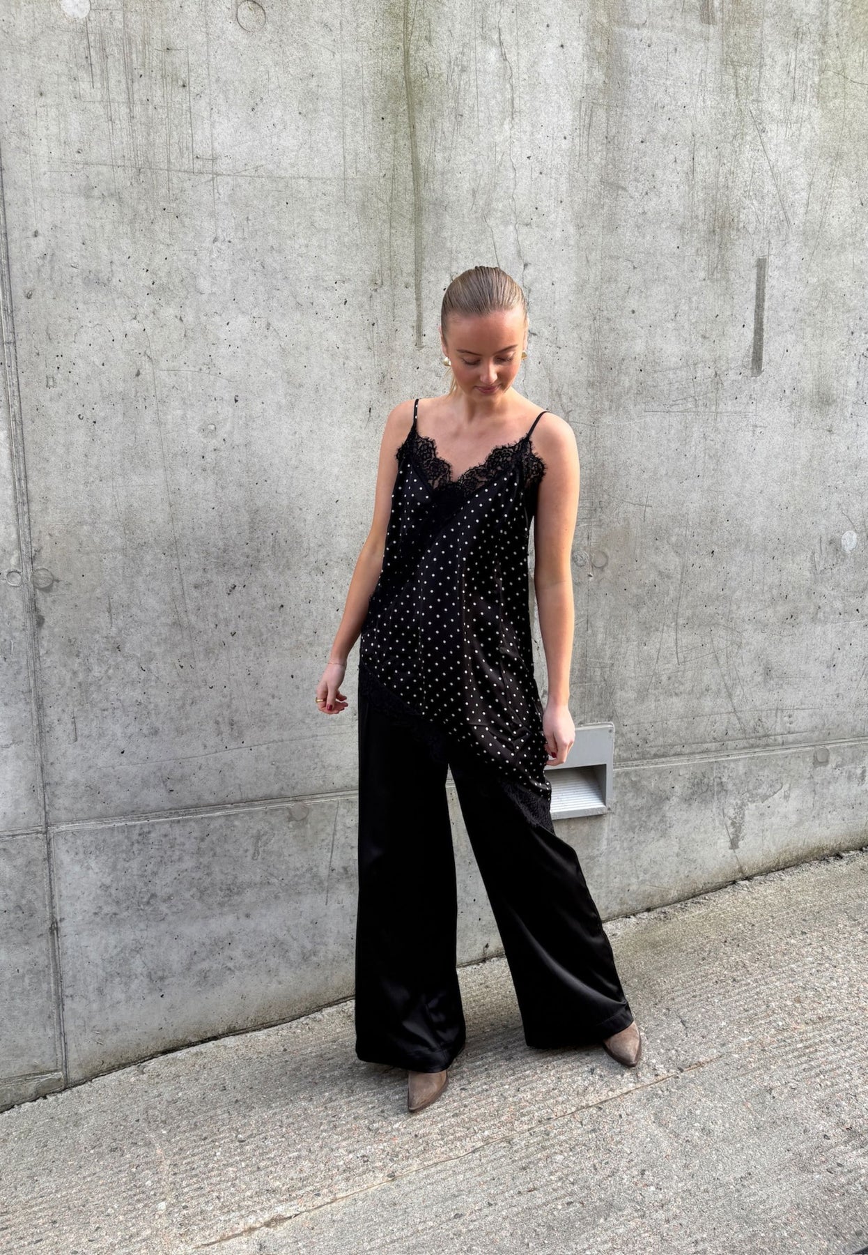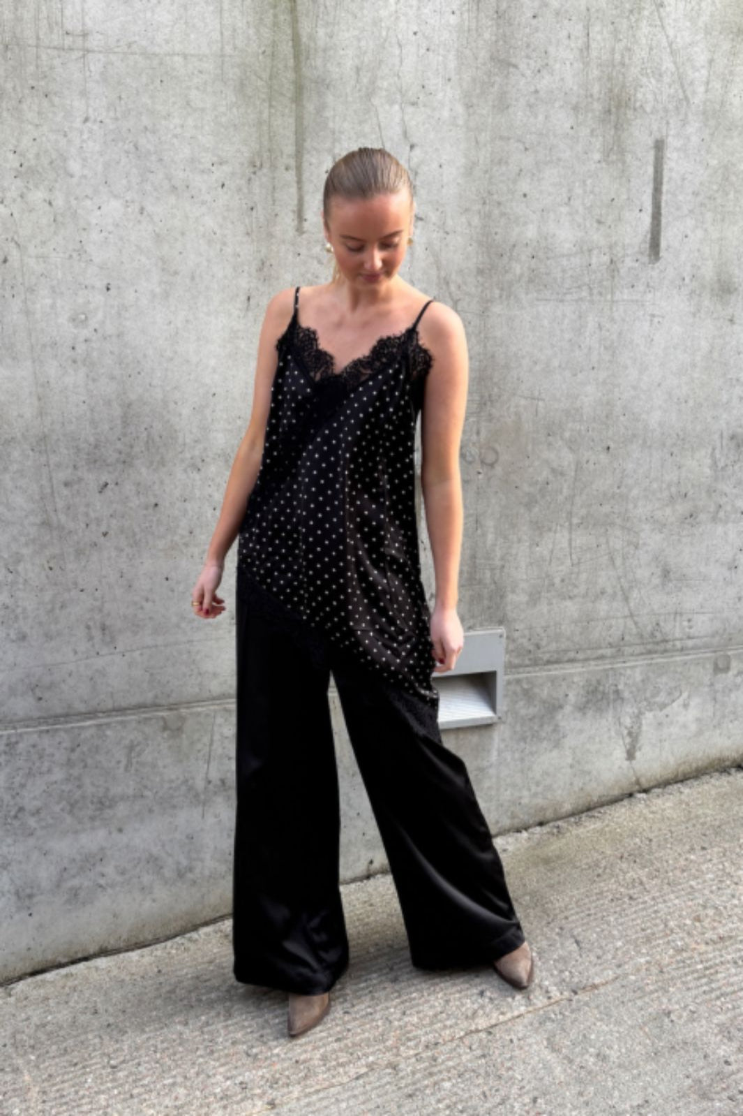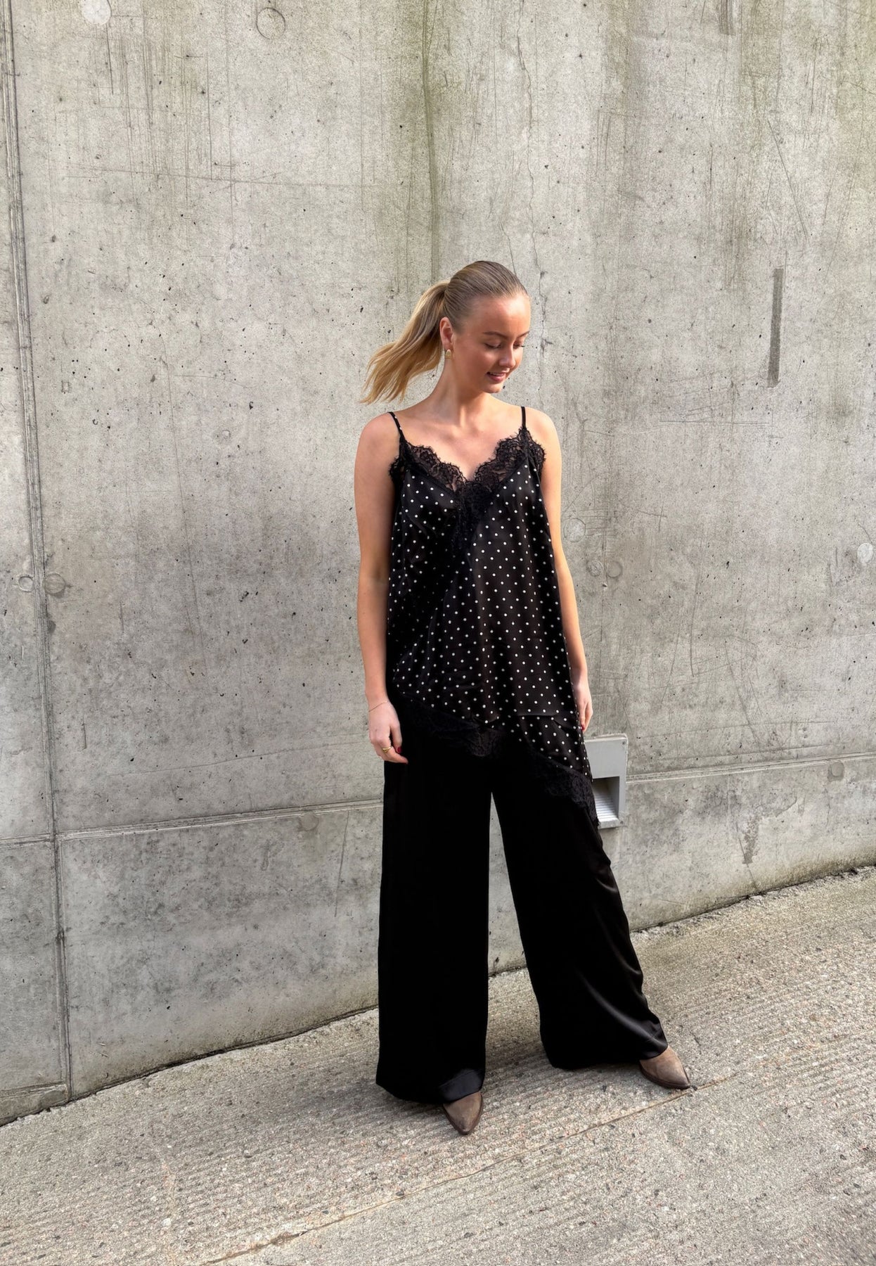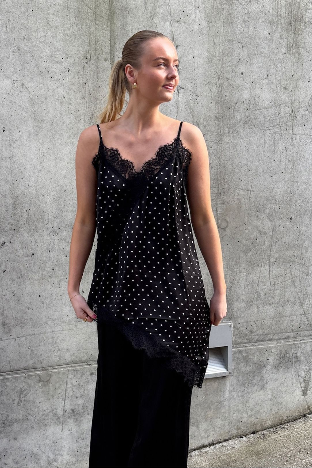 Sort top fra Love & Divine med hvide prikker. Toppen har tynde spaghettistropper og en asymmetrisk blondekant forneden.