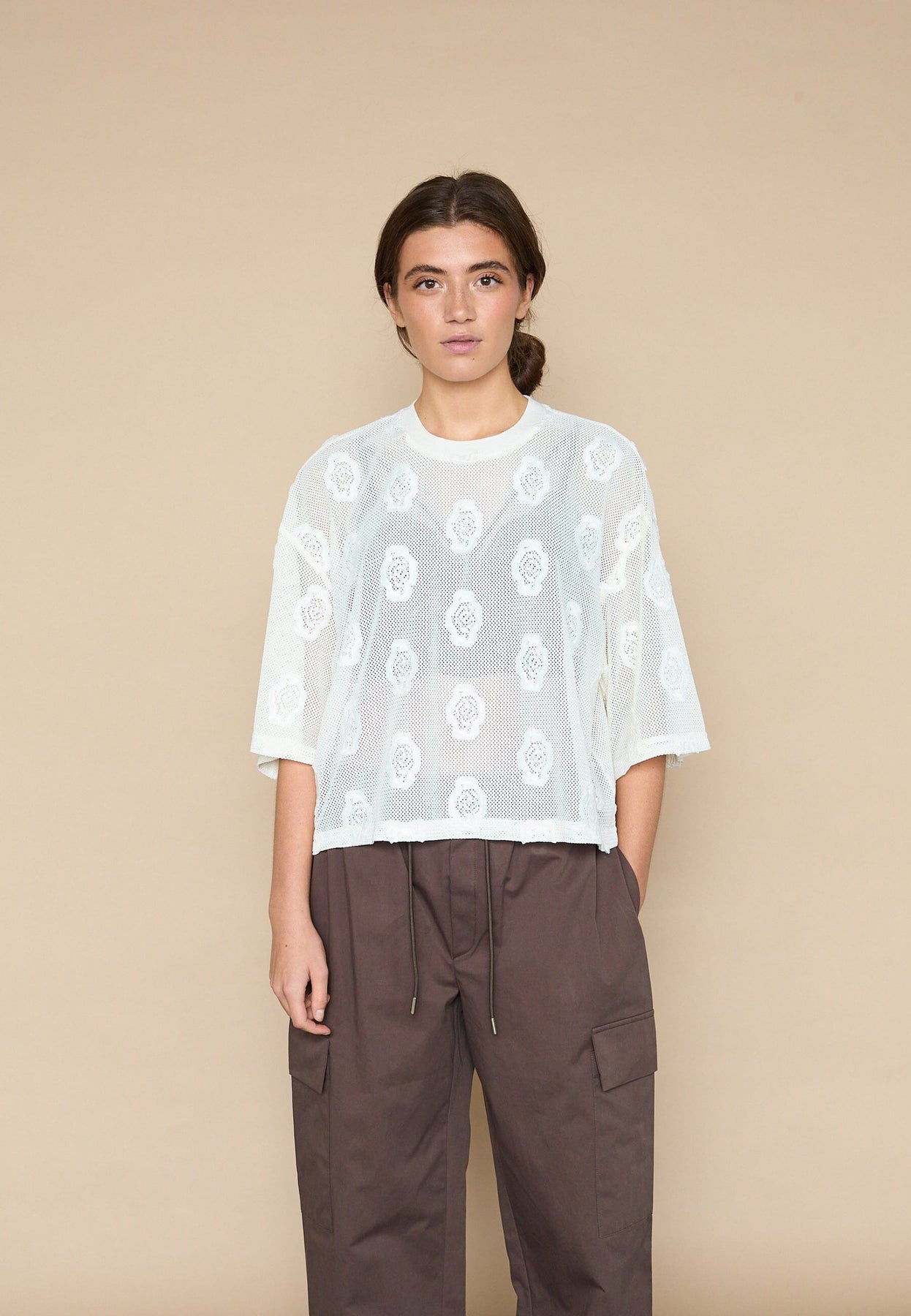 En cremefarvet meshbluse fra Love & Divine med broderede blomsterdetaljer. Blusen har et netmønster med en let gennemsigtig effekt.