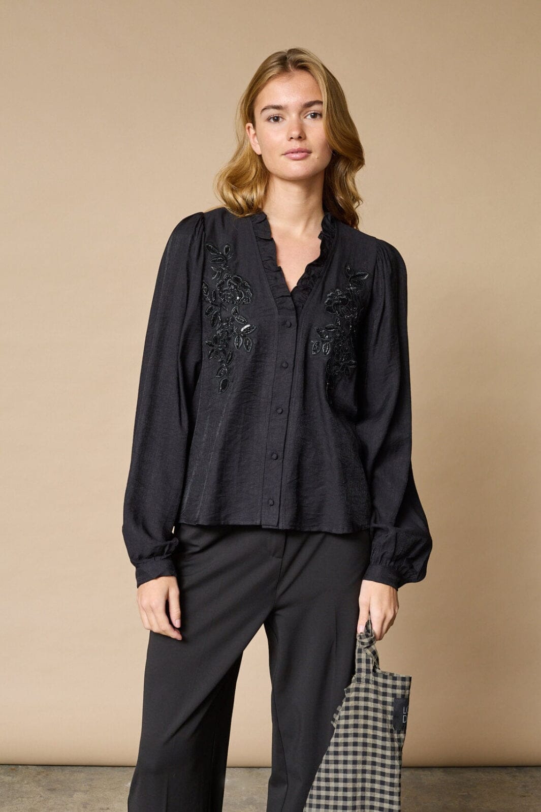 Sort skjorte fra Love & Divine med blomstret broderi, pailletter og flæser på forsiden. Den har en rynket krave ved V-halsen og lange ærmer med manchetter.