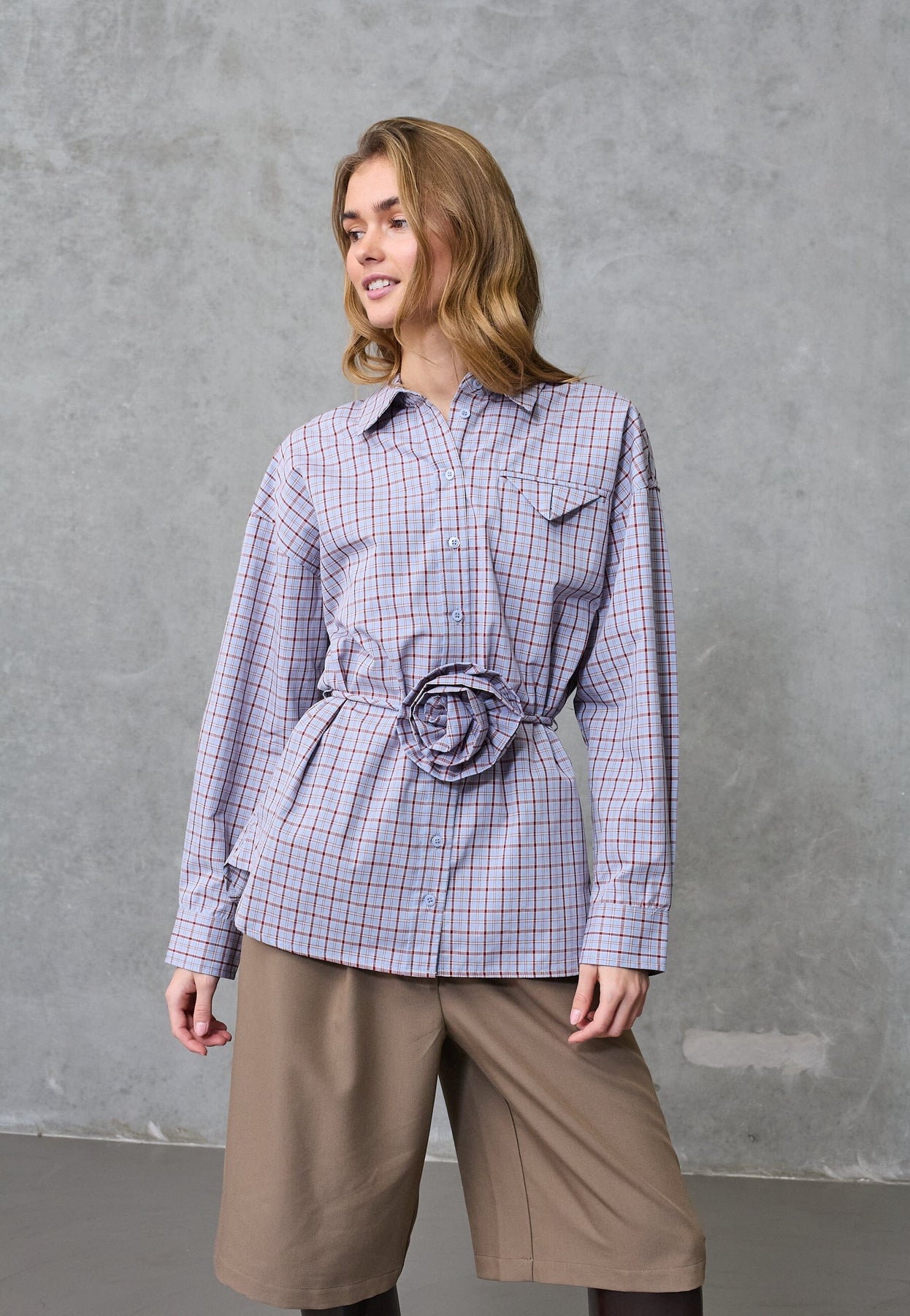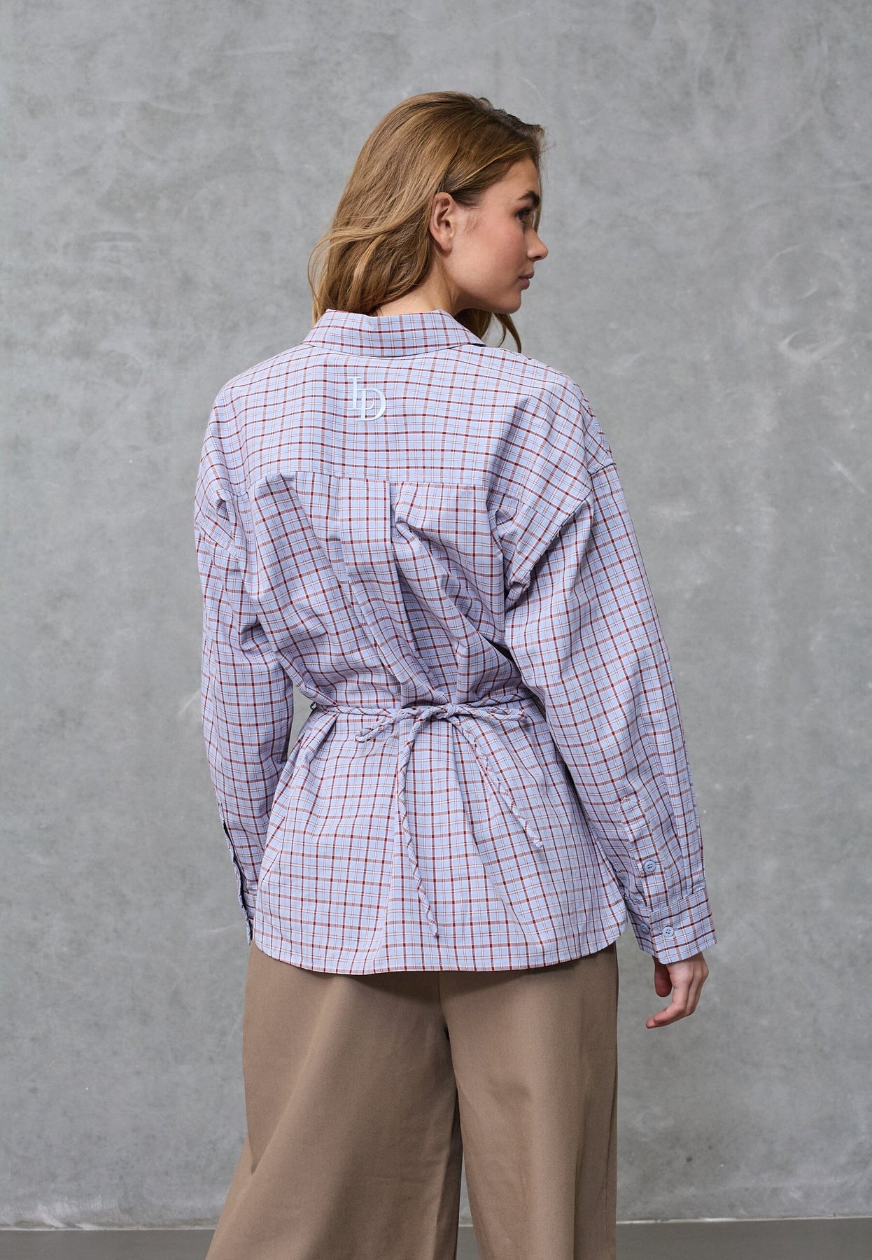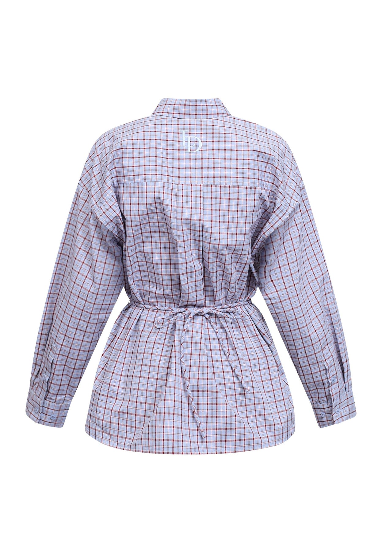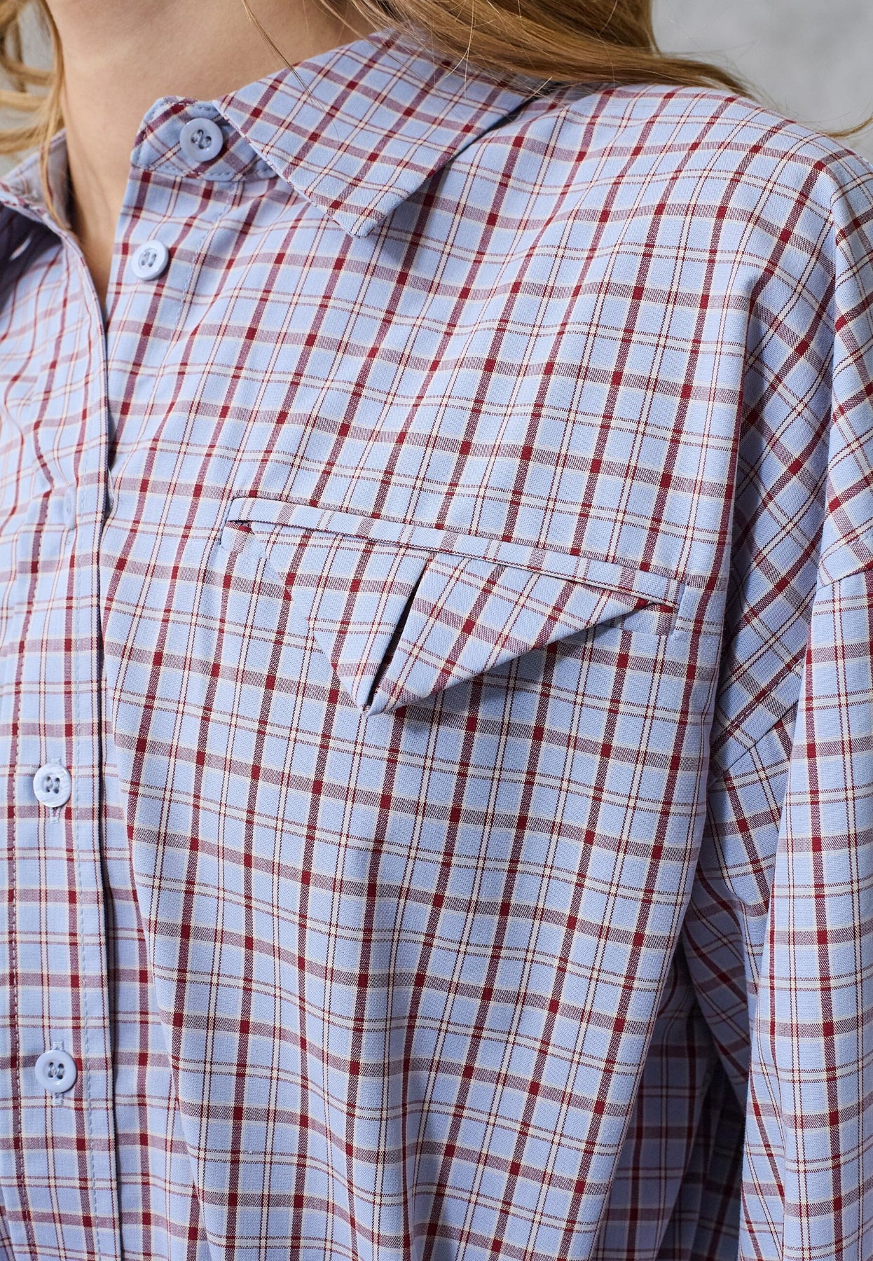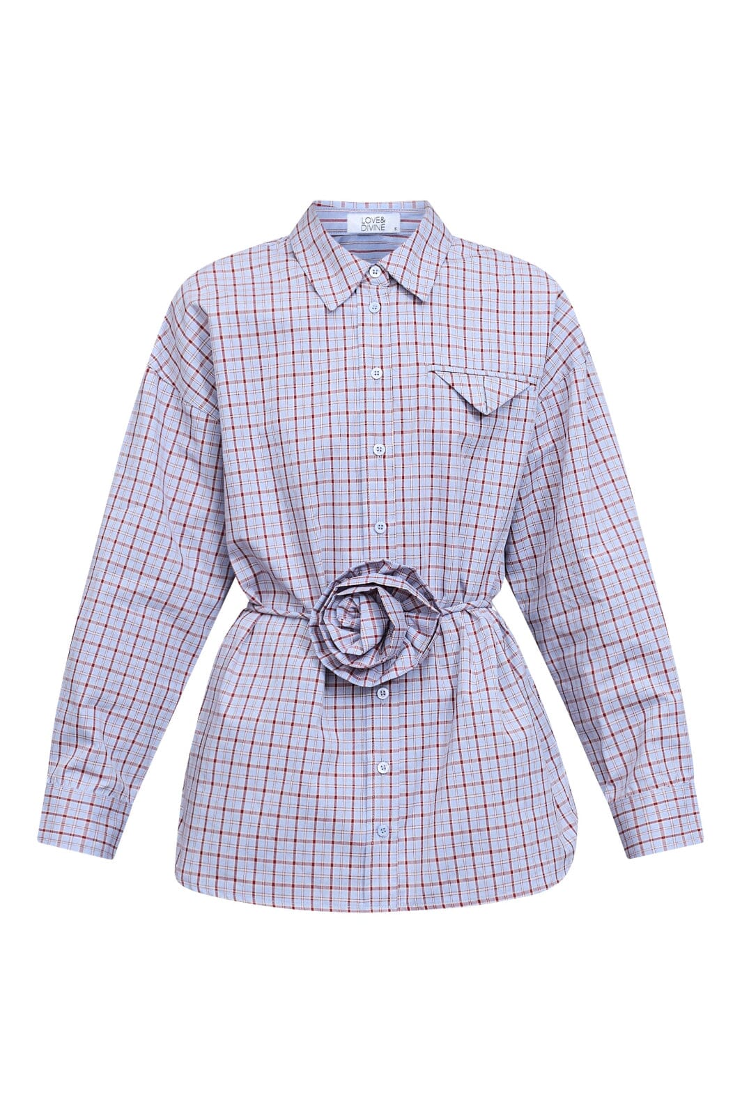 Ternet skjorte fra Love & Divine i lyseblå, blå og røde nuancer. Skjorten har en klassisk skjortekrave og en oversized pasform med lange ærmer.