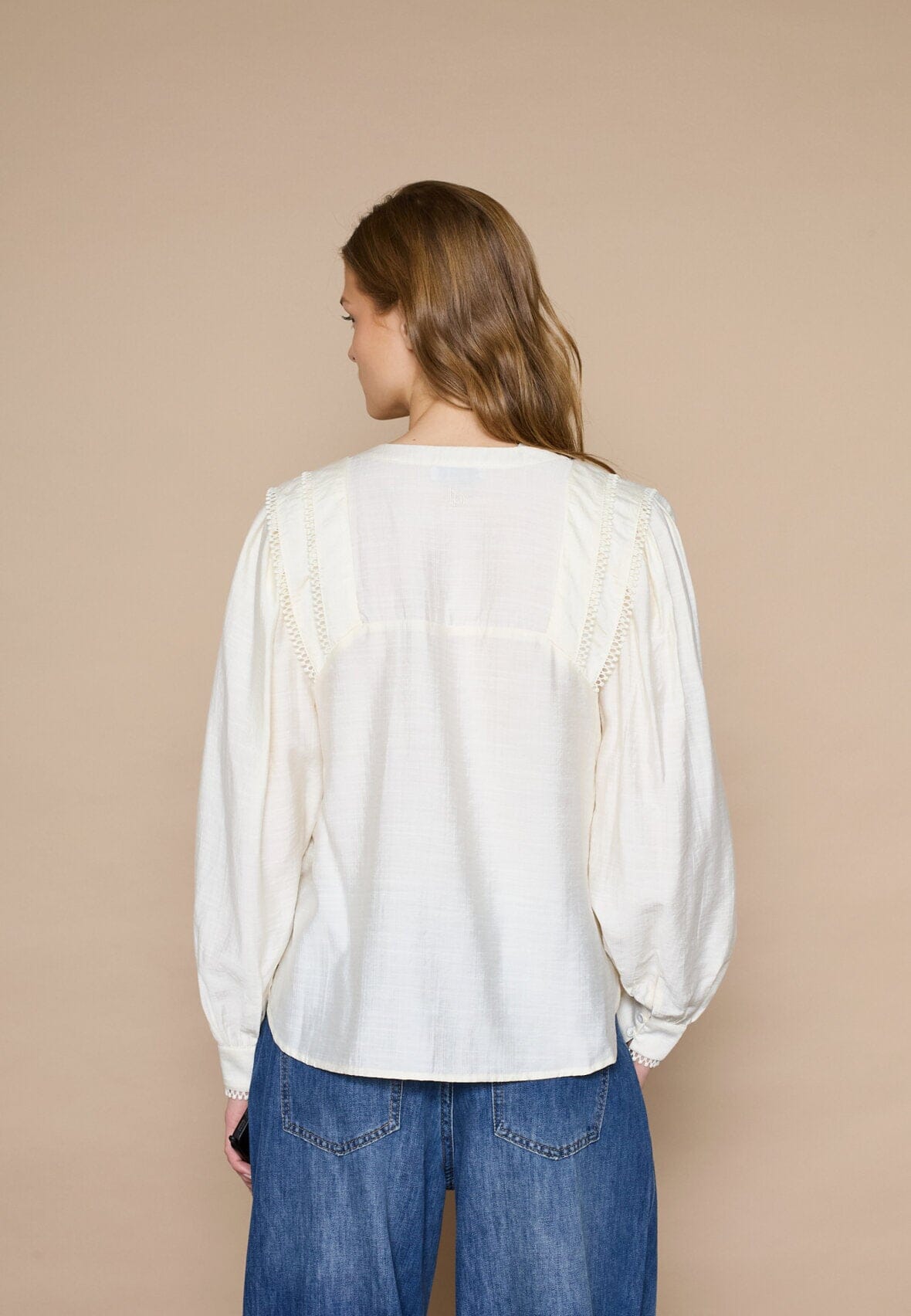 Cremefarvet bluse fra Love & Divine med løs pasform og lange ærmer. Blusen har en V-hals og dekorative flæsedetaljer på skuldrene og manchetterne.