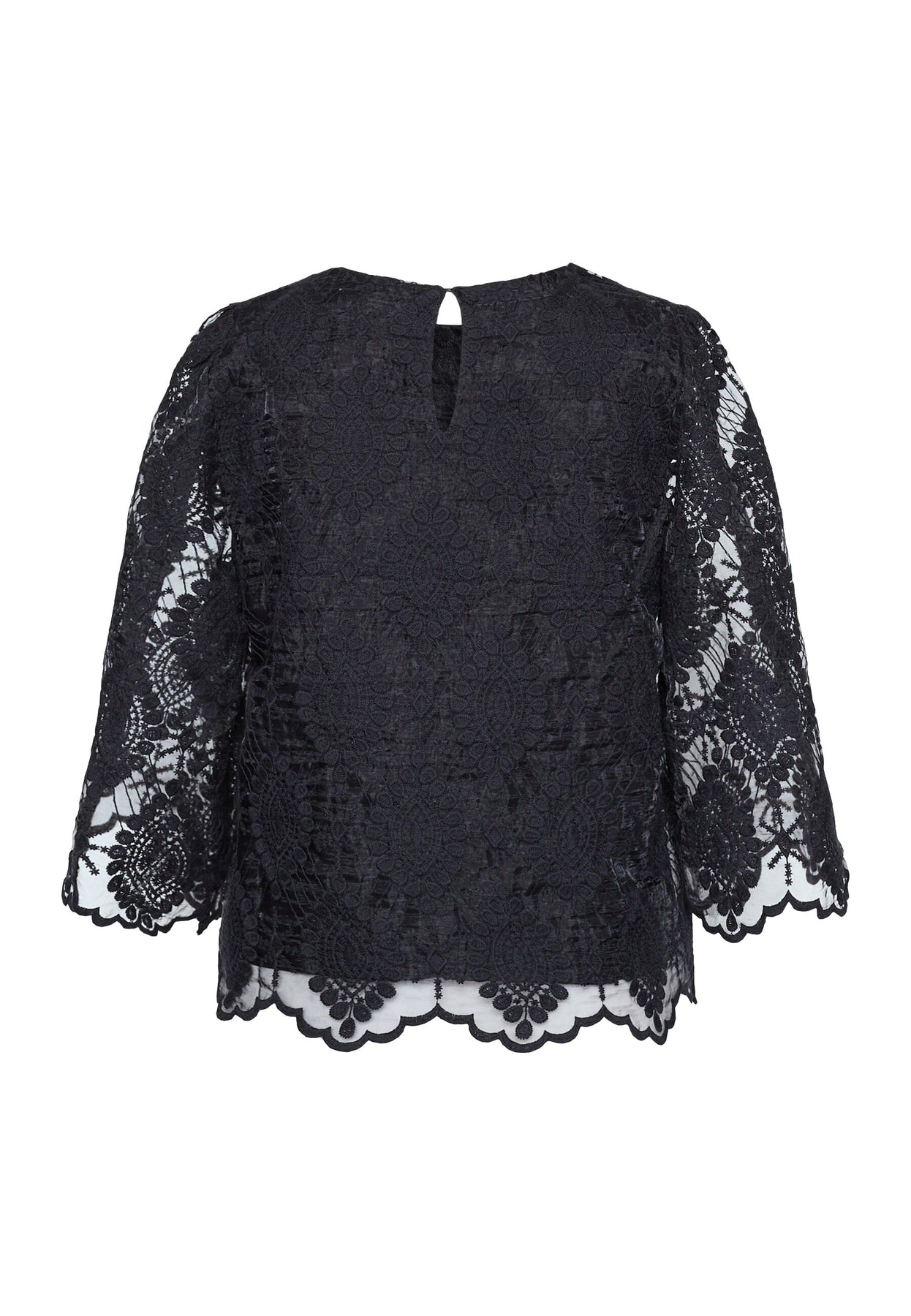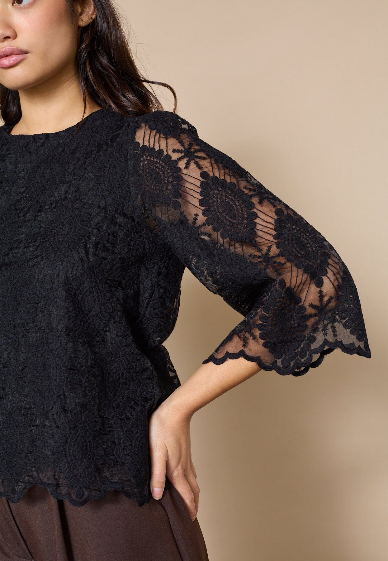 Sort blondebluse fra Love & Divine, lavet af 100 % polyester med et blomsterblonde-design og trekvartlange ærmer med blondemønster.