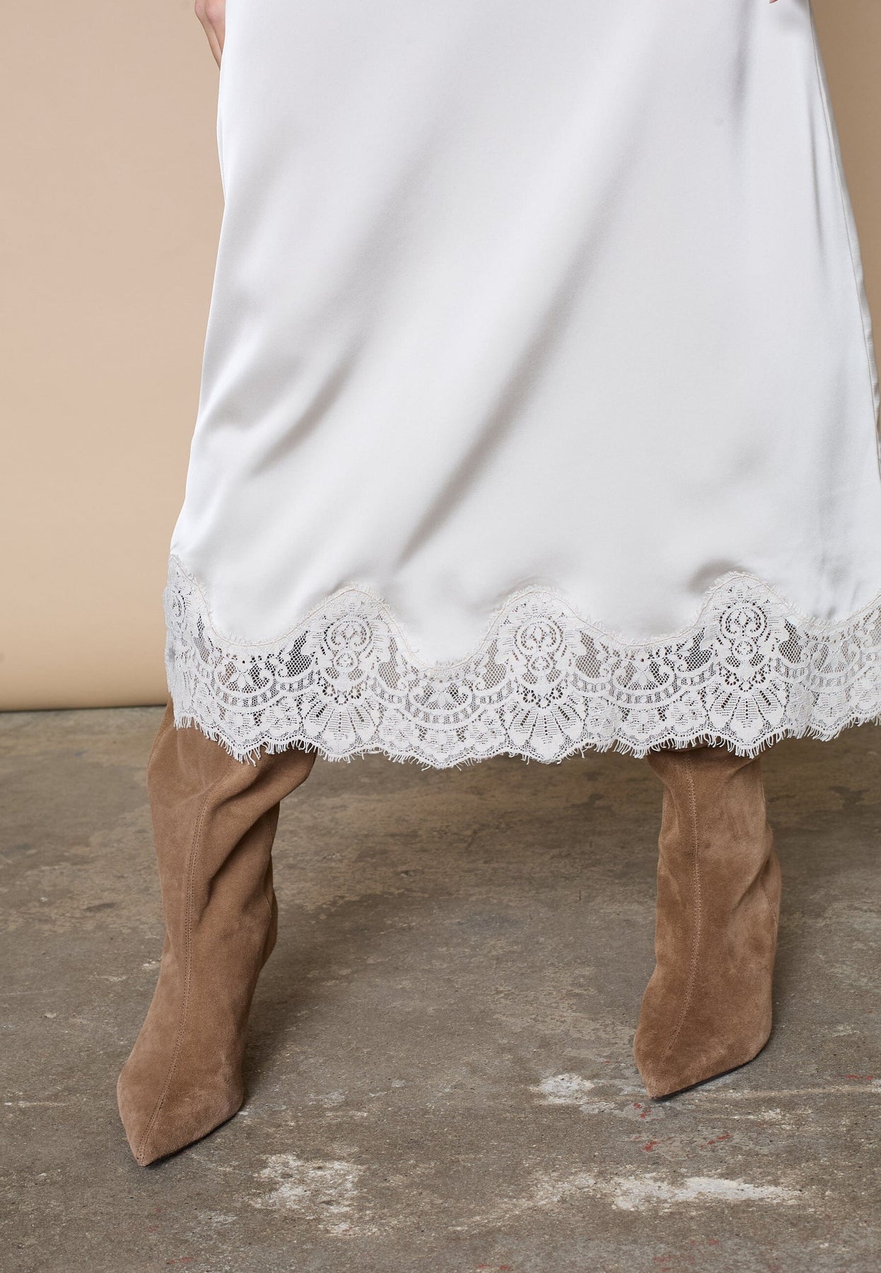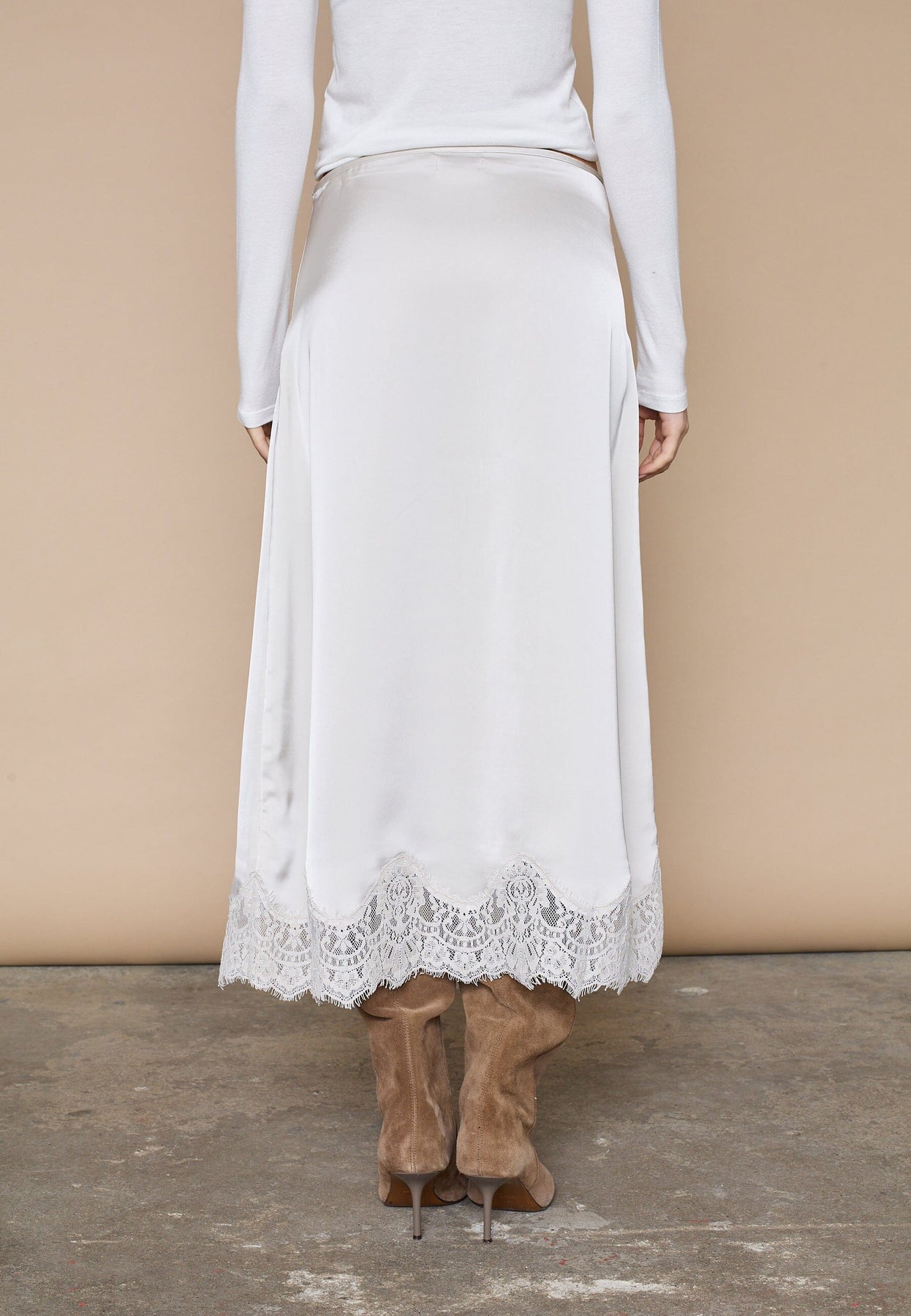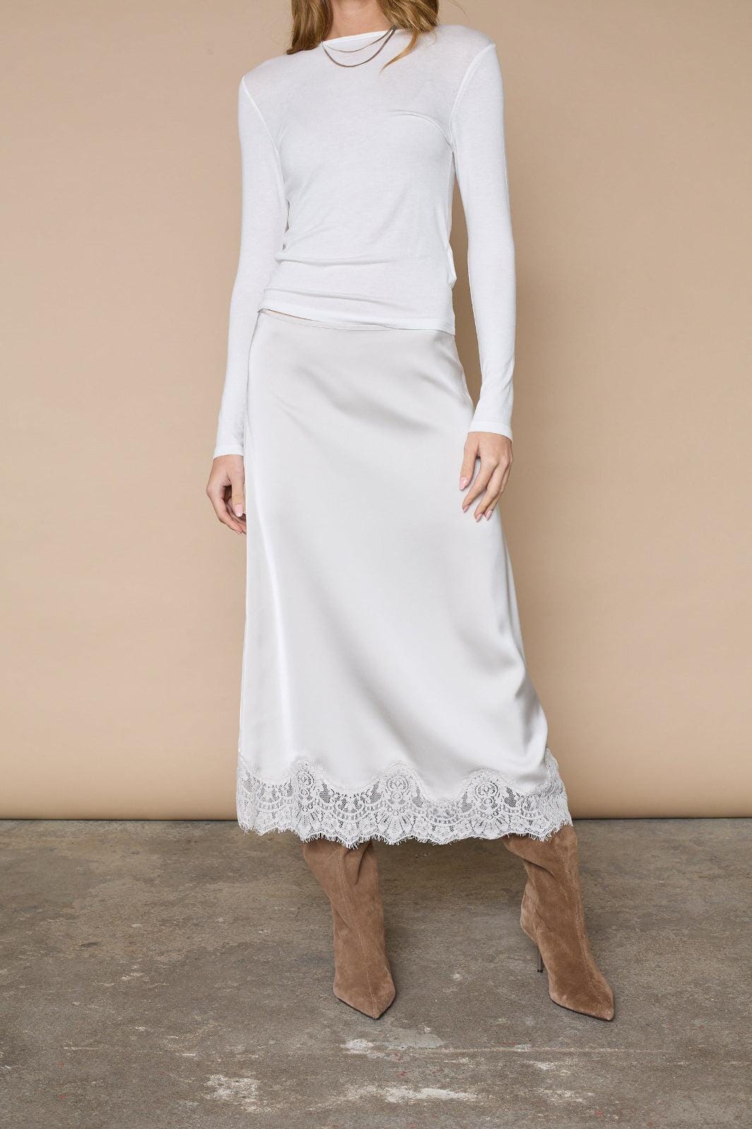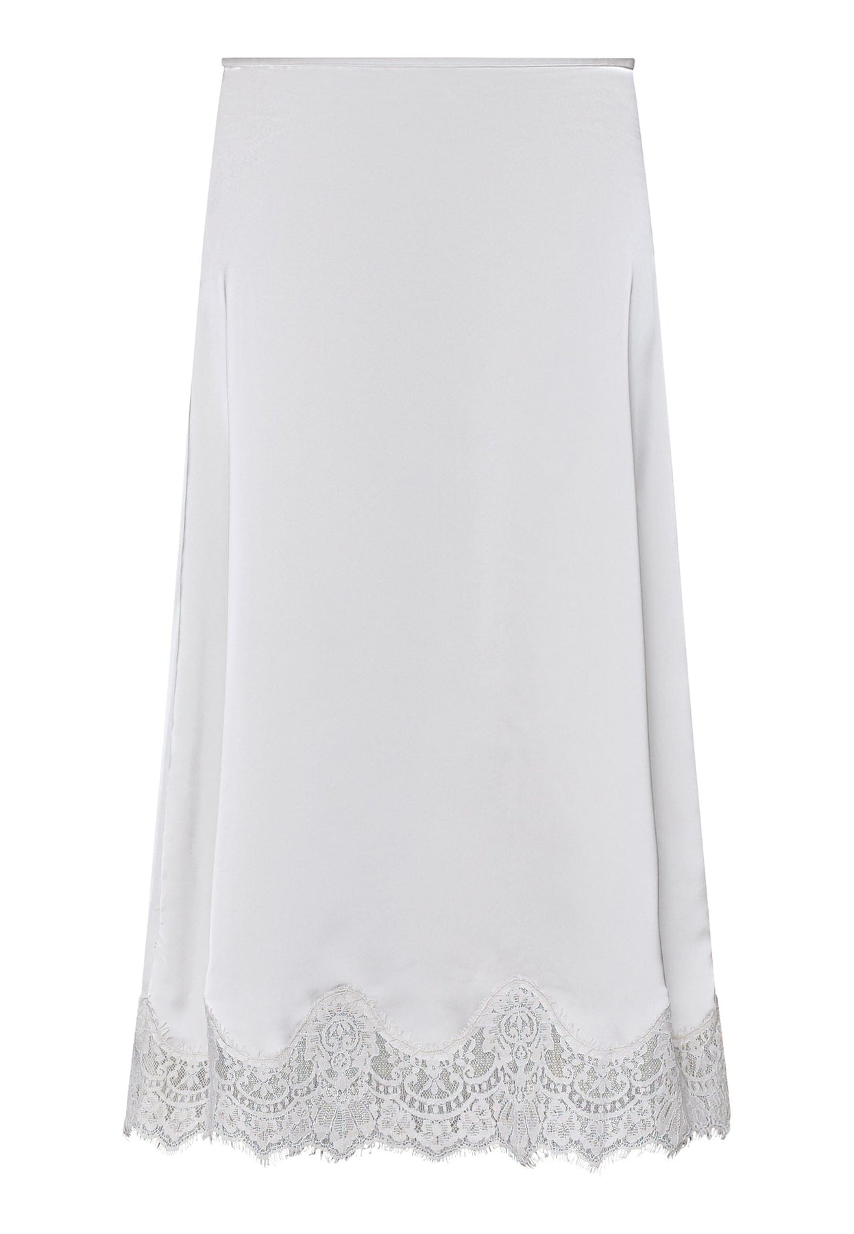 En lang nederdel fra Love & Divine i hvid og cremefarvet nuance. Nederdelen har en glat og skinnende overflade med blondekant langs kanten.
