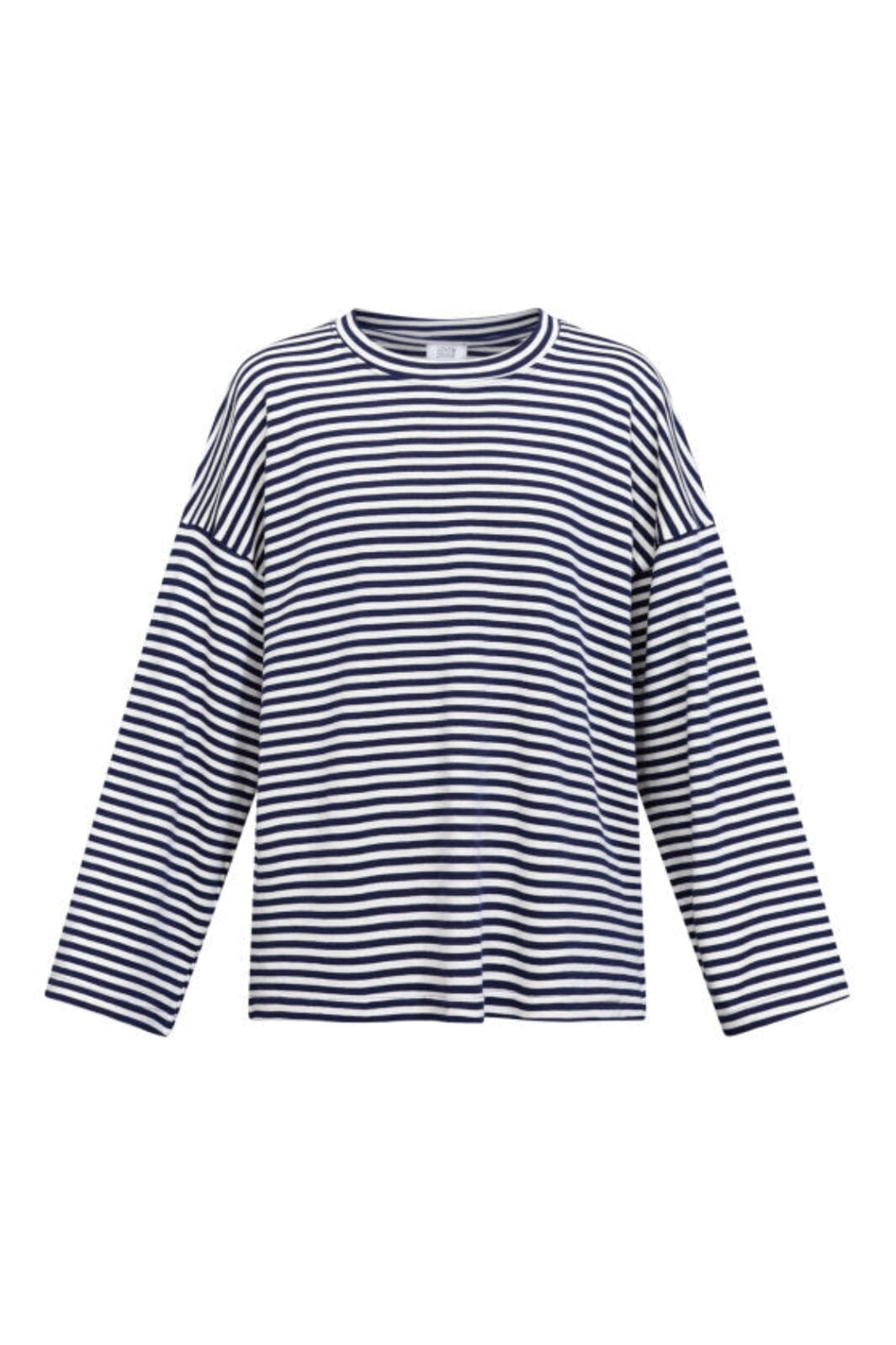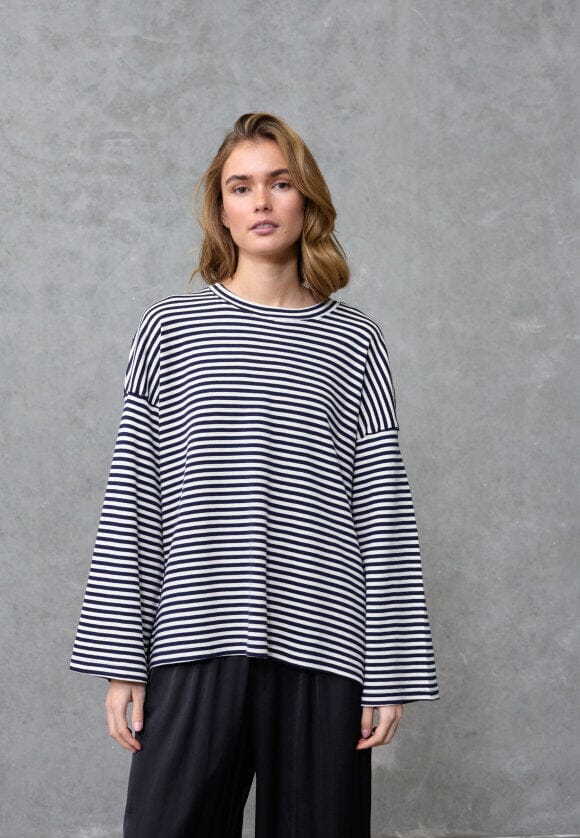 Stribet bluse fra Love & Divine i creme og mørkeblå. Blusen er lavet af 100 % bomuld og har et klassisk stribet mønster med broderidetaljer.