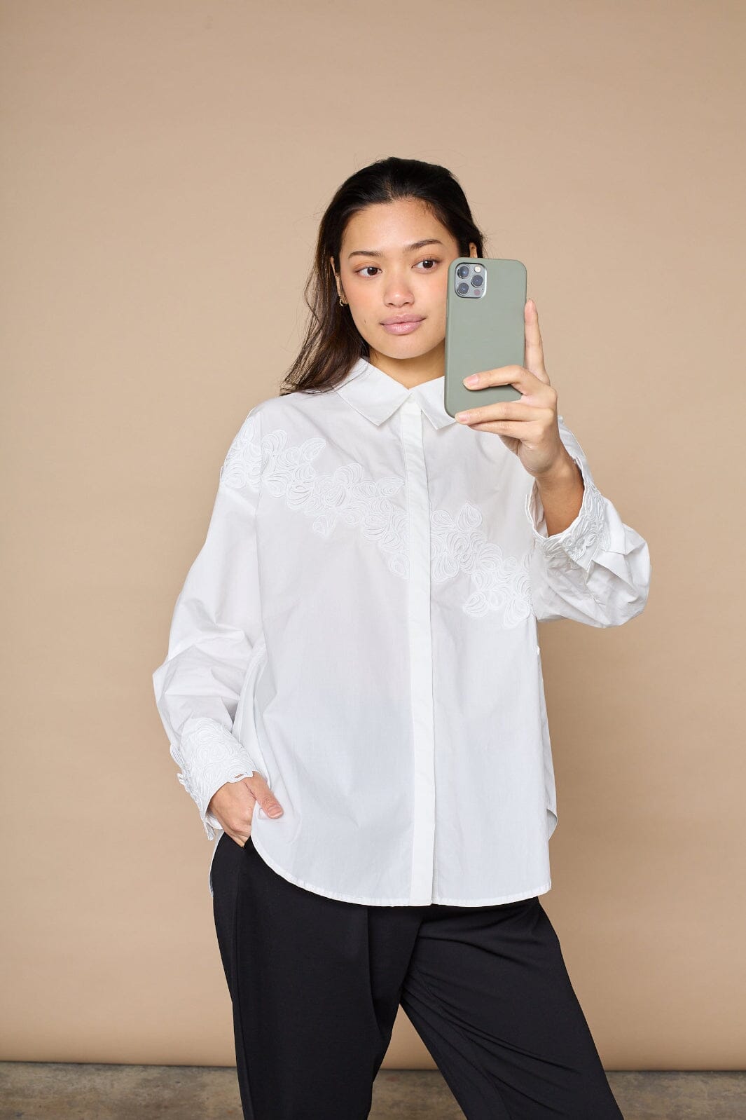 Hvid bluse fra Love & Divine, lavet af 100 % bomuld. Den hvide farve gør blusen nem at kombinere med andre farver.