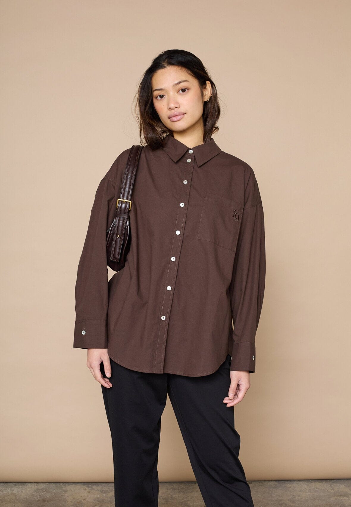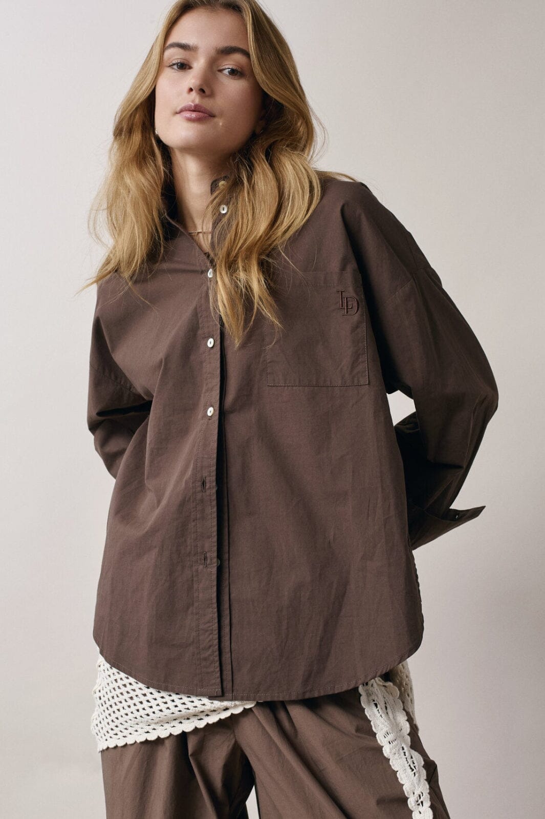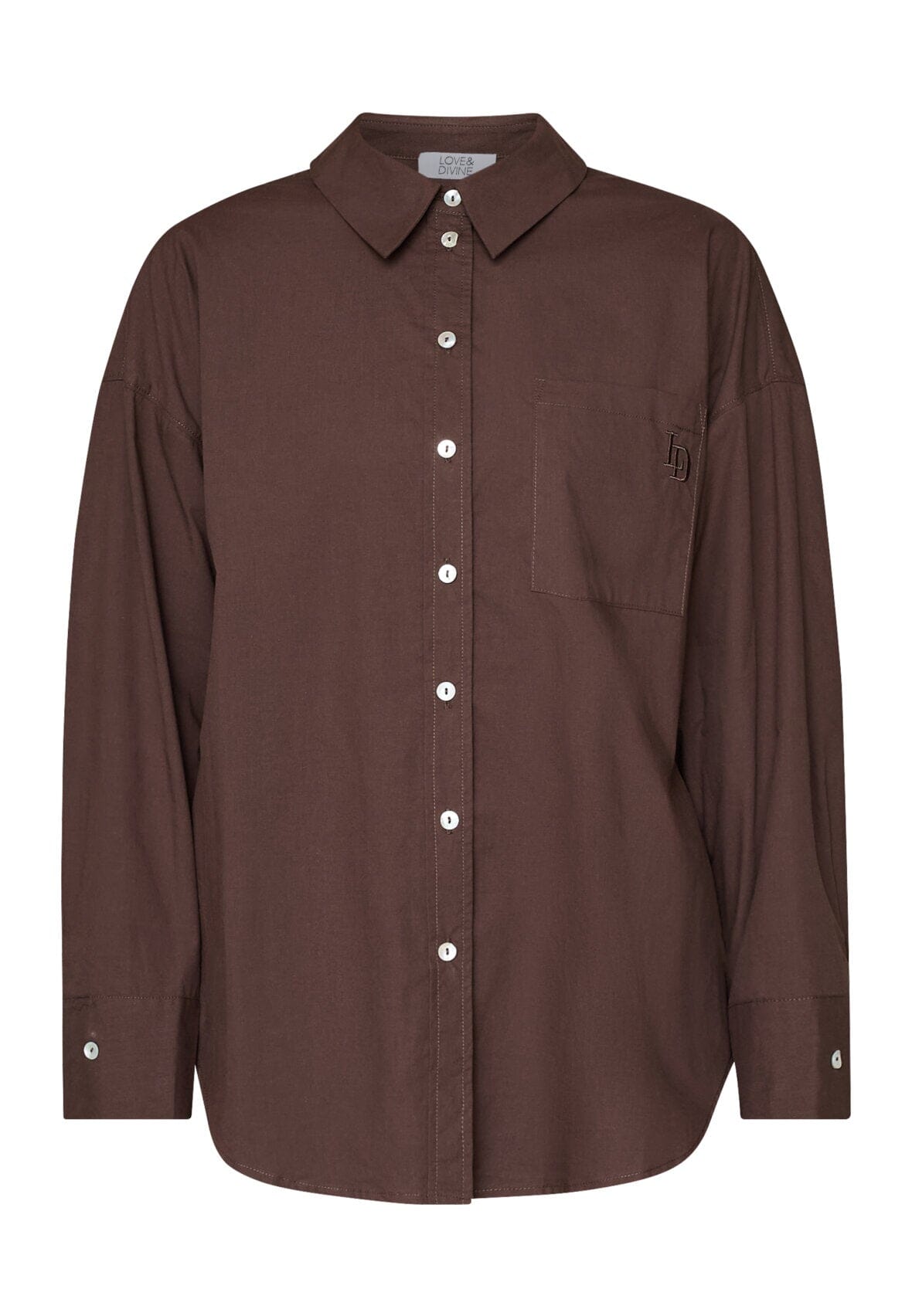 Brun skjorte fra Love & Divine med broderi på brystlommen. Skjorten har en oversized pasform, lange ærmer og en knaplukning foran.