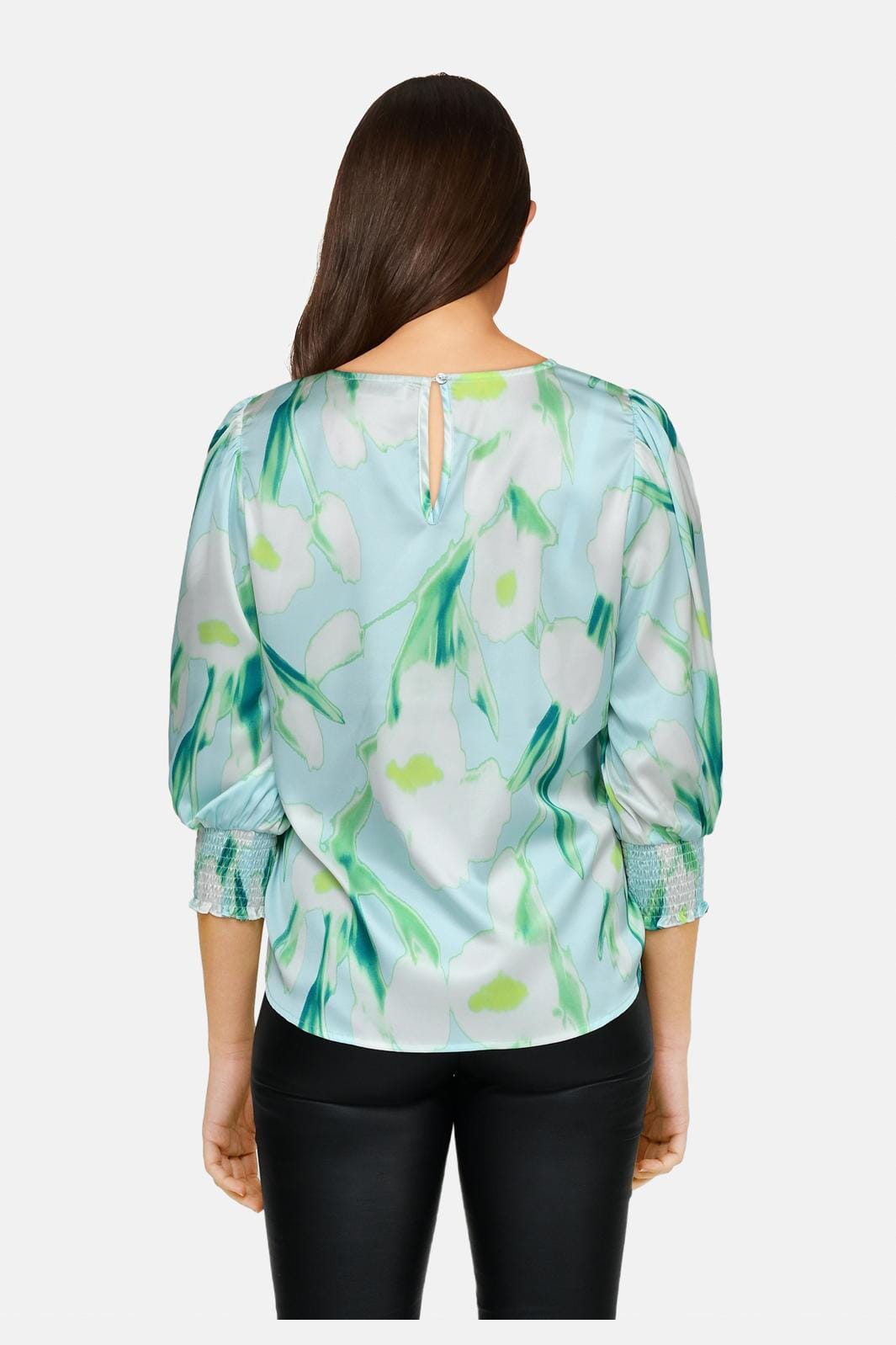 Love915-3 er en bluse med et feminint forårs blomsterprint. blusen har en normal pasform, en rund hals og stumpeærmer med smock forneden.