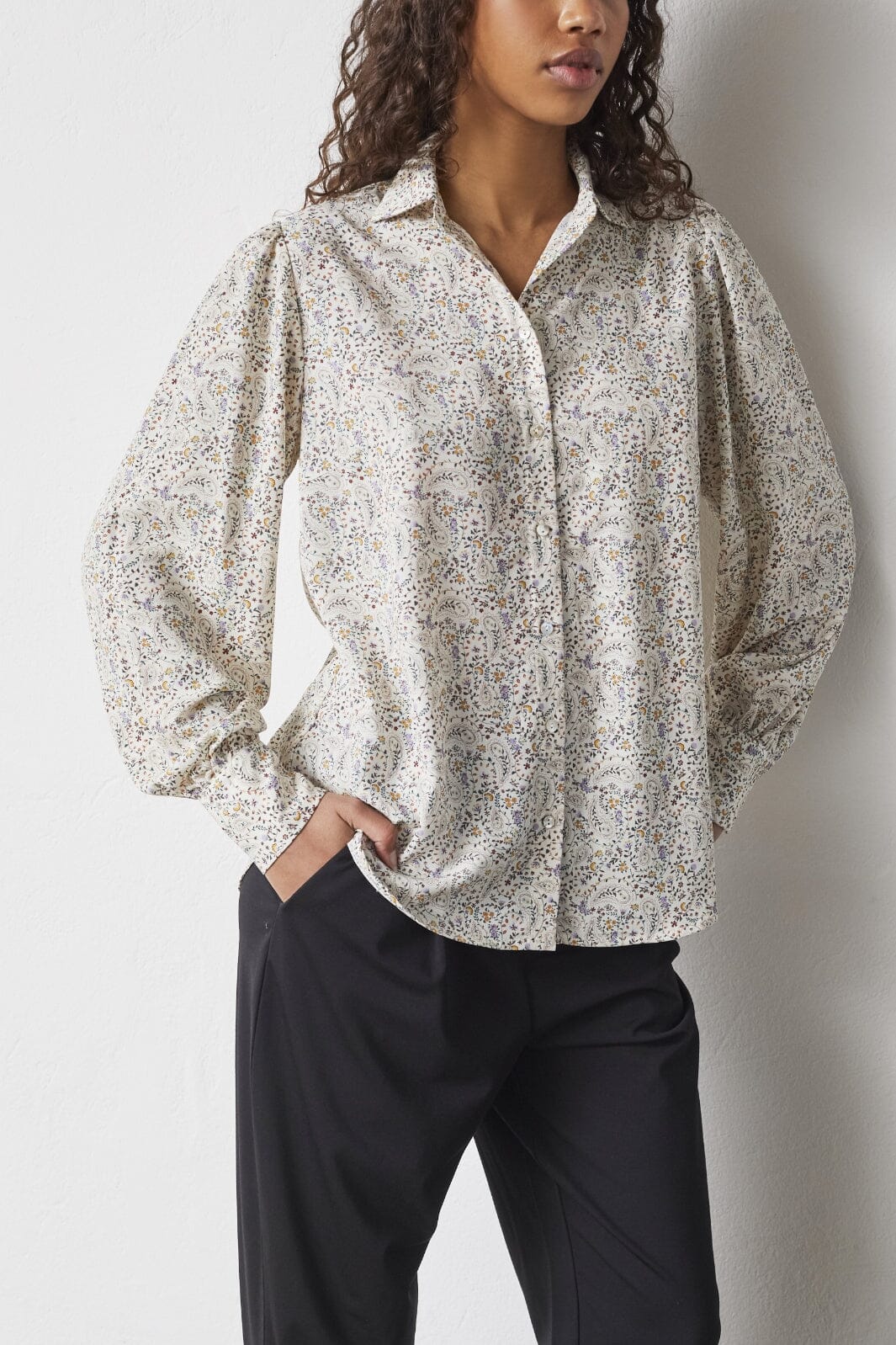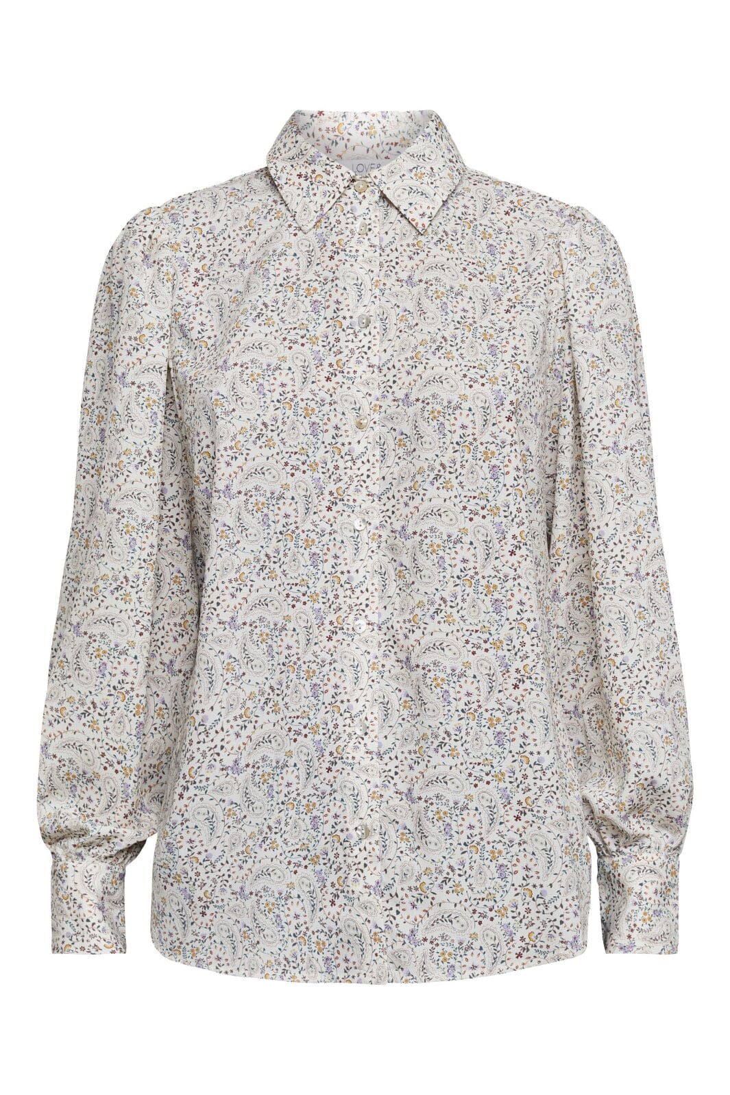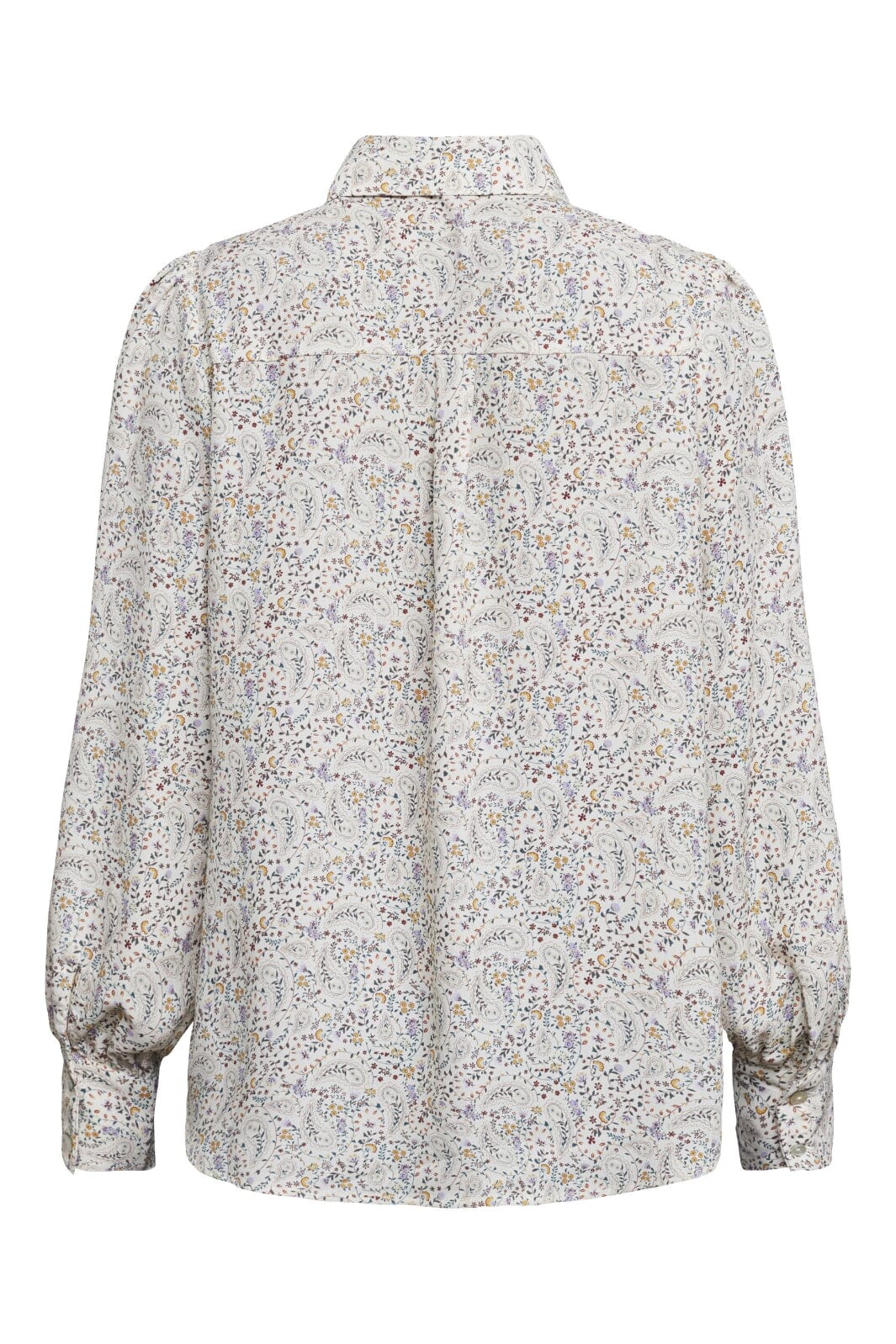 Cremefarvet bluse med paisley-mønster fra Love & Divine. Den har puffede ærmer med manchetter og en klassisk skjortekrave med knaplukning foran.