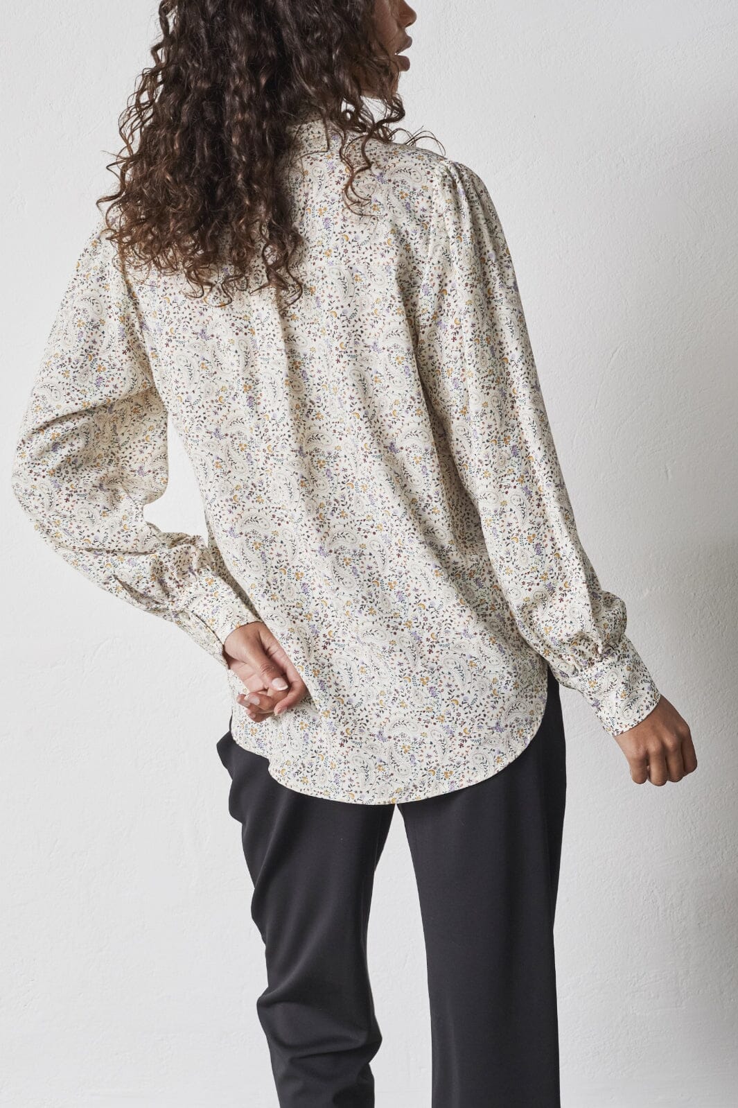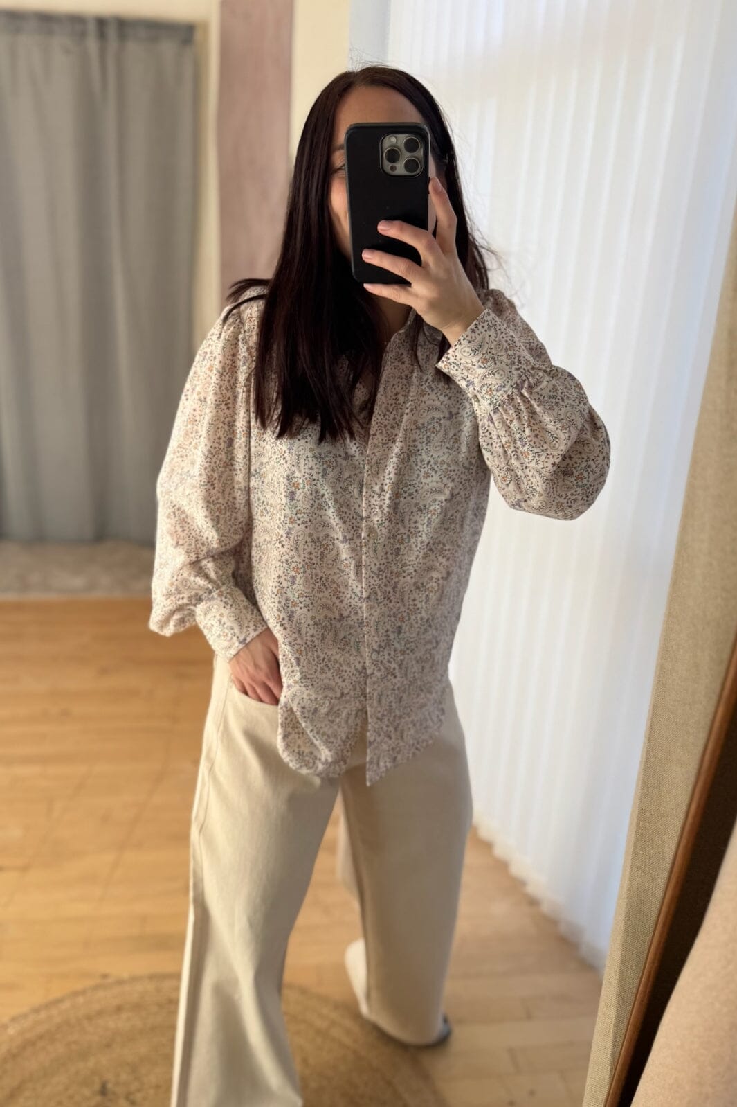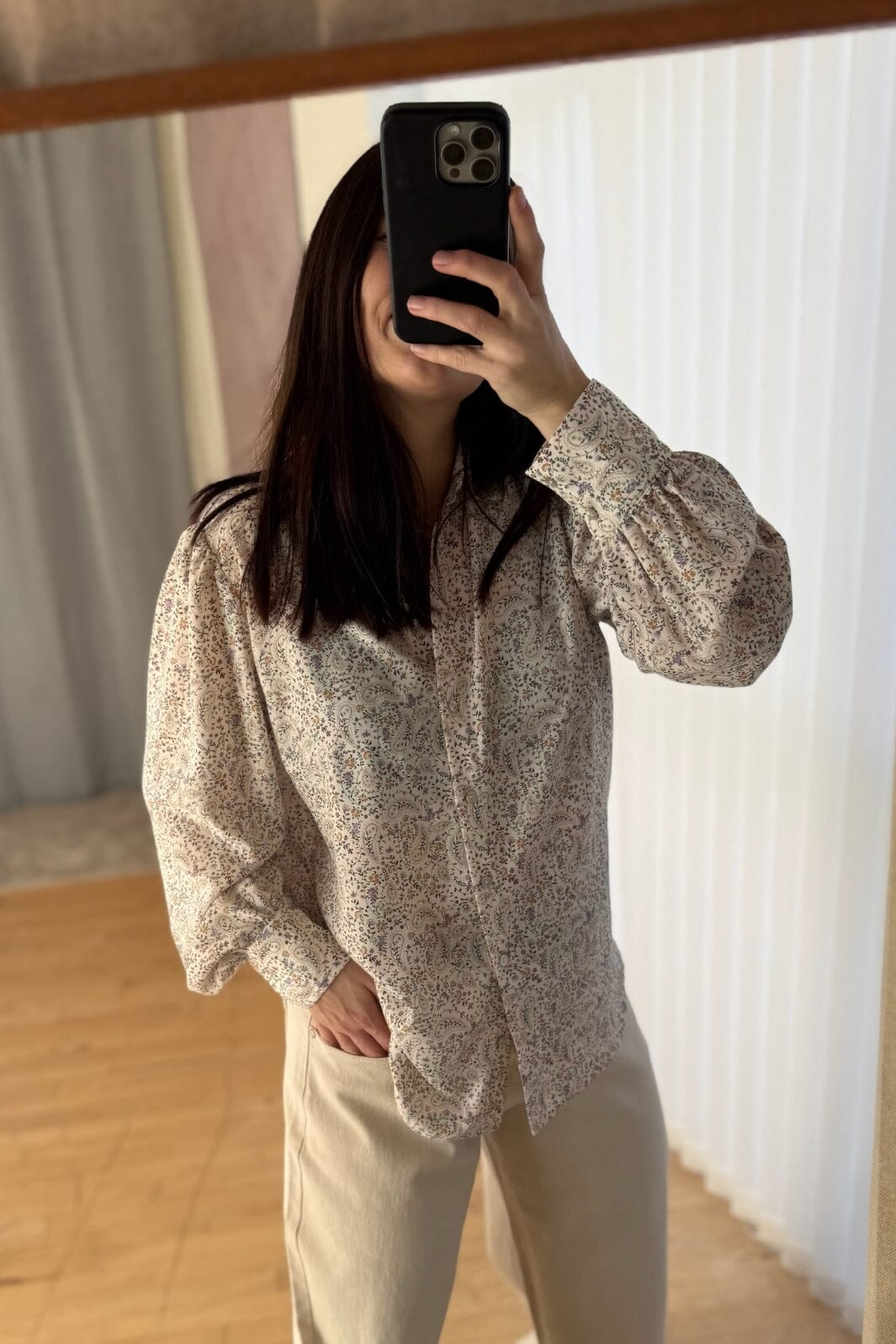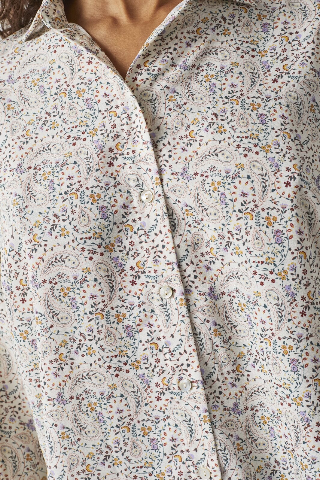 Cremefarvet bluse med paisley-mønster fra Love & Divine. Den har puffede ærmer med manchetter og en klassisk skjortekrave med knaplukning foran.