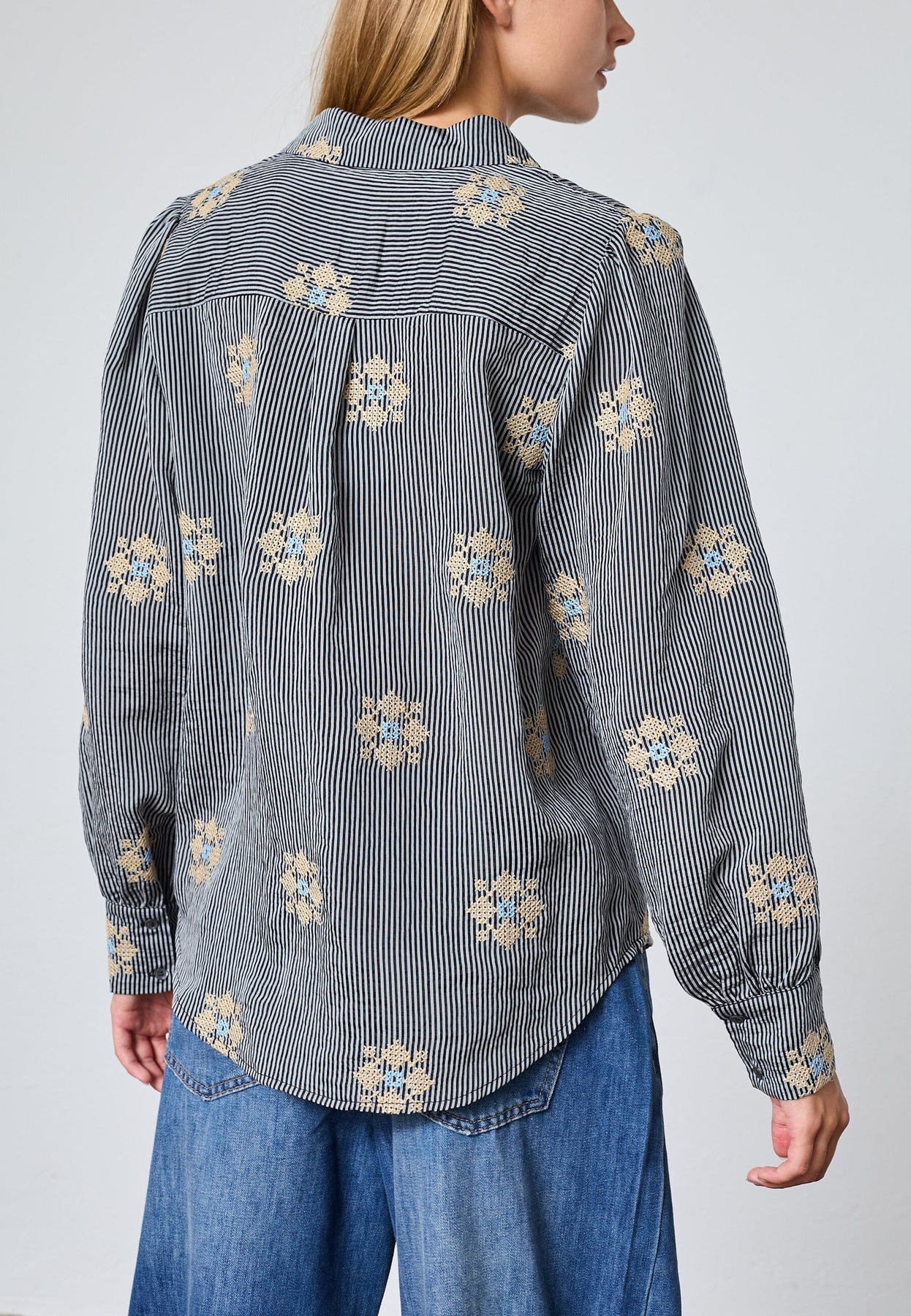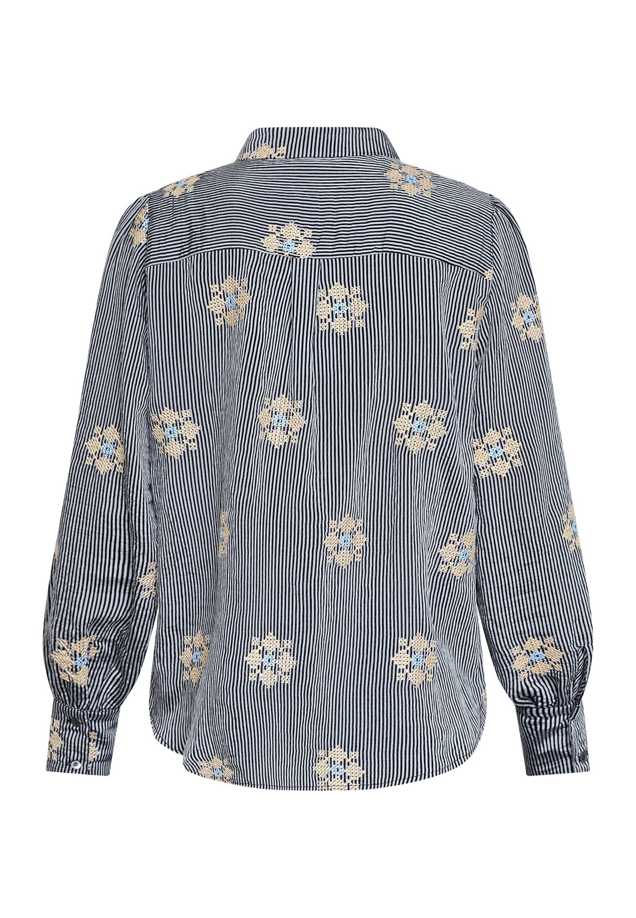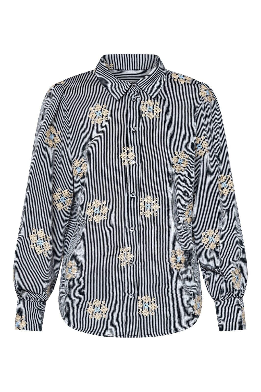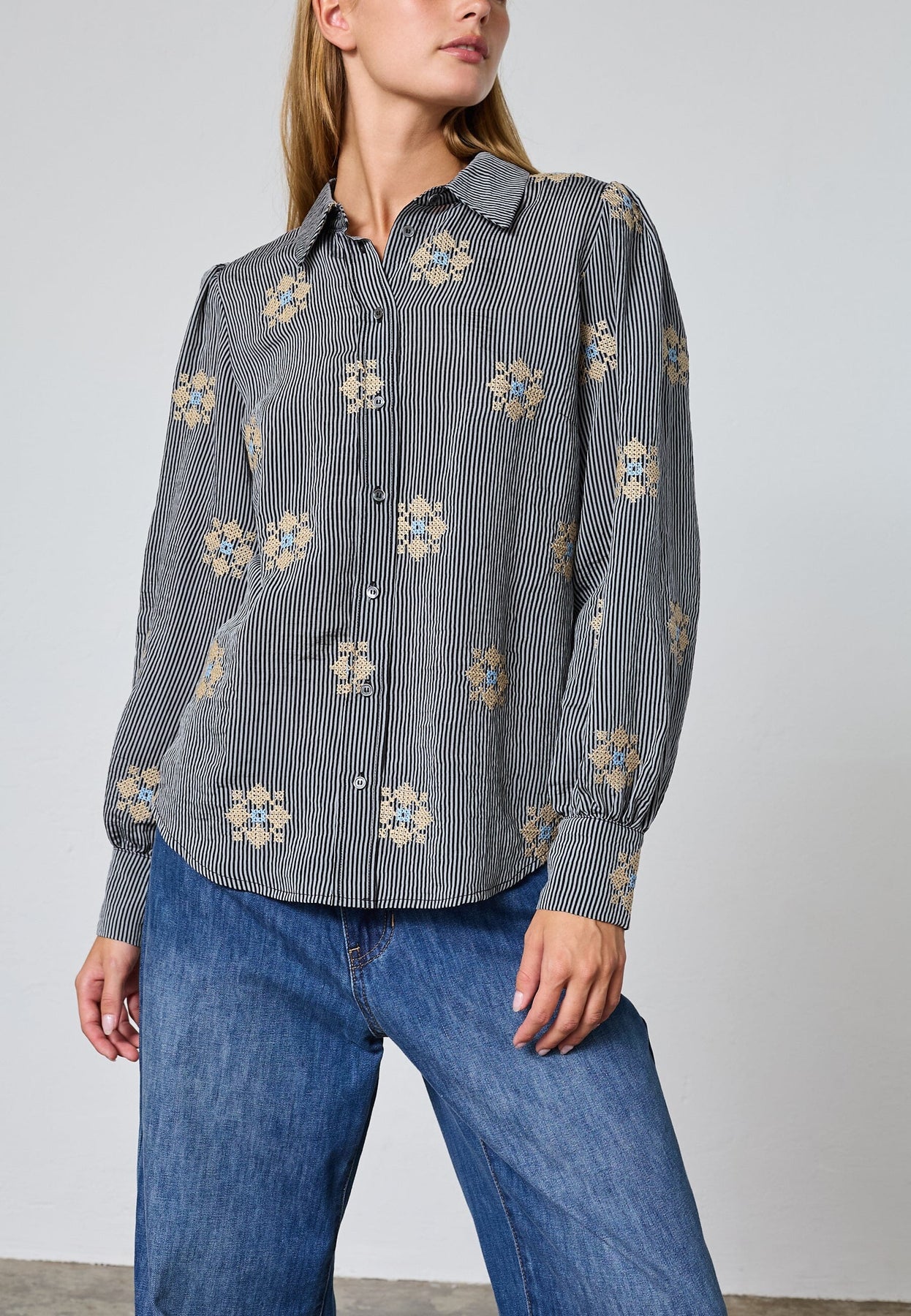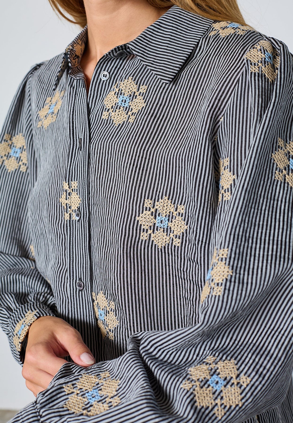 Stribet skjorte fra Love & Divine med sorte og hvide striber. Skjorten har broderede blomsterdetaljer, der skaber kontrast til det stribede mønster.