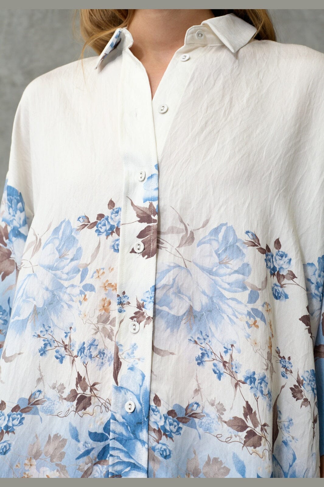 Skjorte fra Love & Divine med blå og brune blomster i et botanisk print. Printet er mest koncentreret i den nederste del med en ombre-effekt.