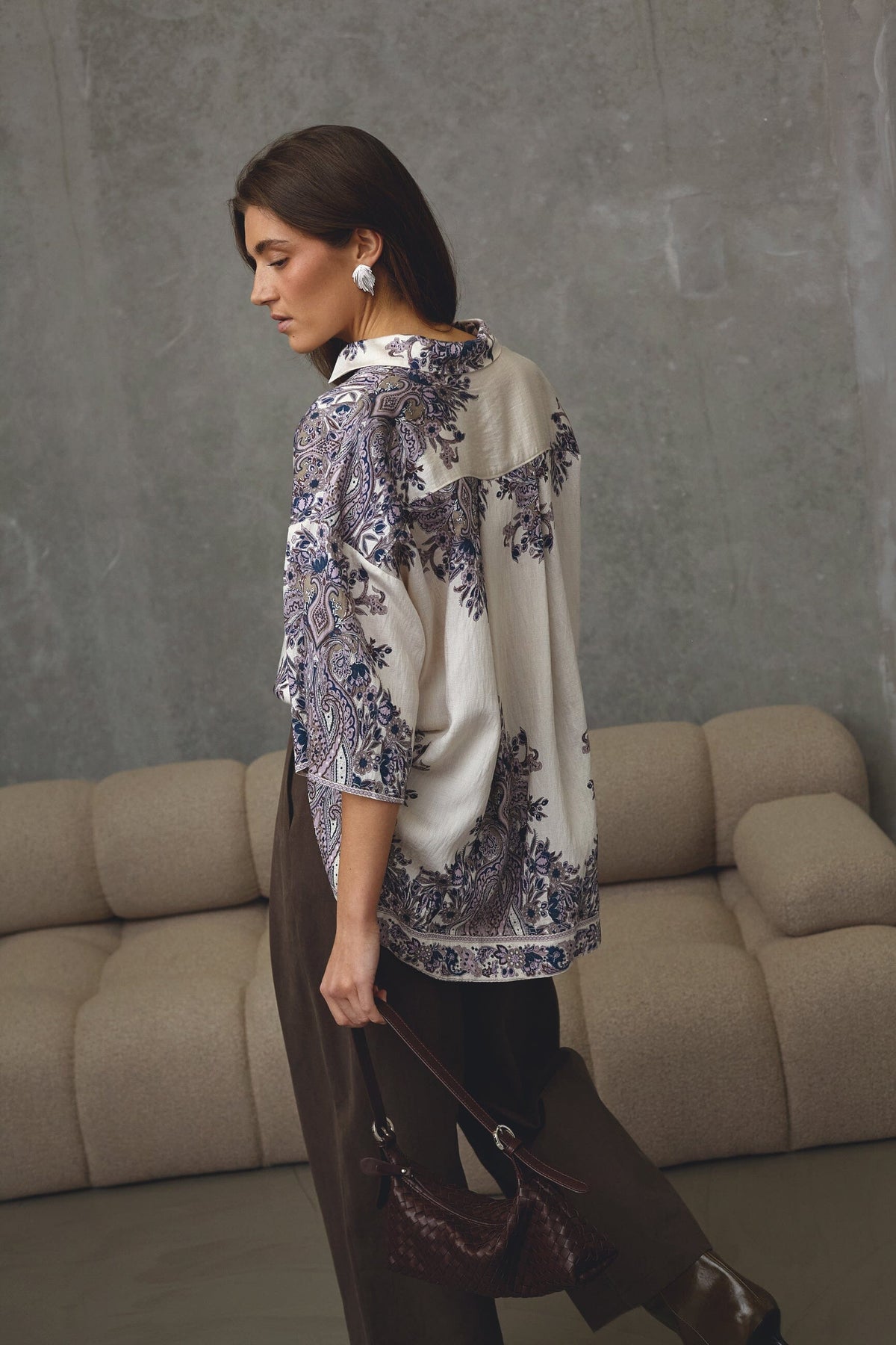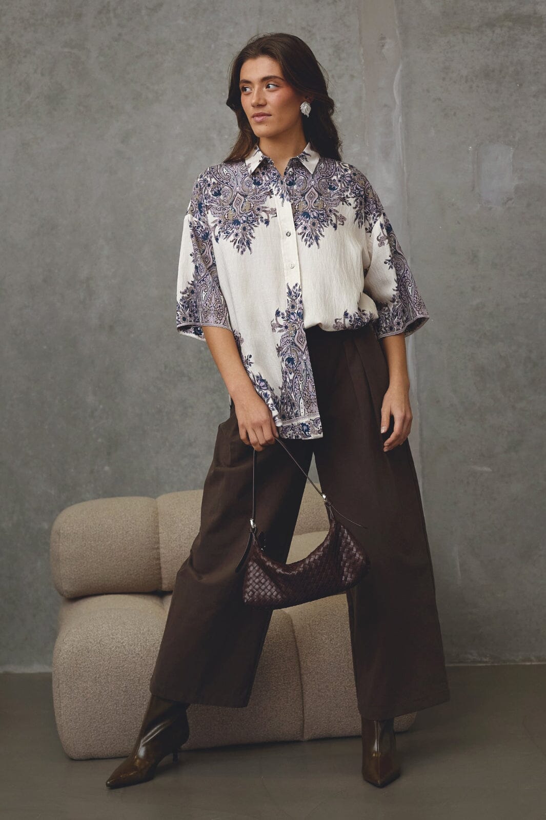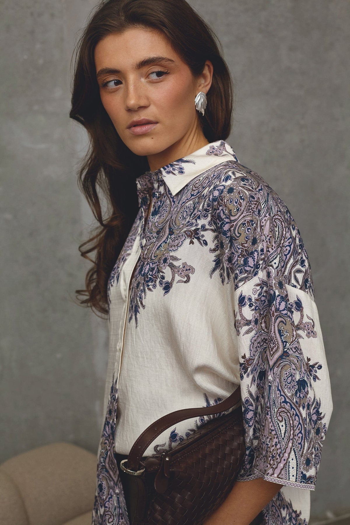 Skjorte fra Love & Divine med et detaljeret paisley-mønster i champagne og blå. Den har en løs pasform og albuelange ærmer.