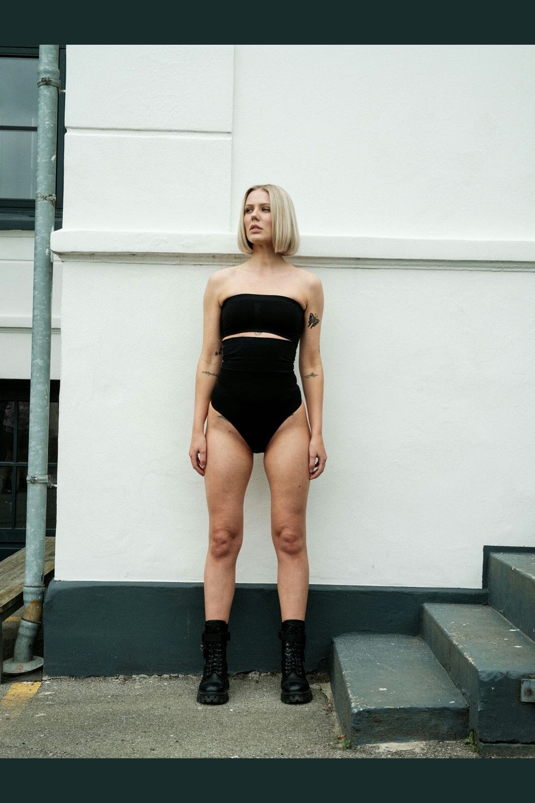 Sort bandeau-bh fra Lykkeland Ateliér med glat overflade og midtersøm. En enkel bh med rund form og god støtte.