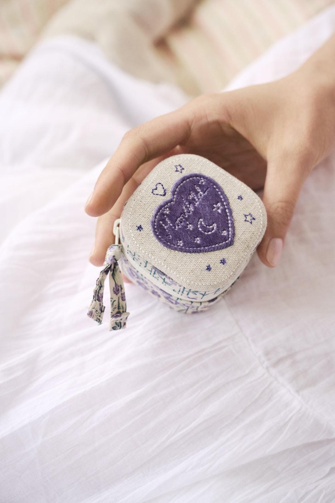 Smykkeboks fra Maanesten med blomstret mønster og lilla hjerte på låget. Den har en genanvendt lynlås og flere rum indvendigt til opbevaring af smykker.