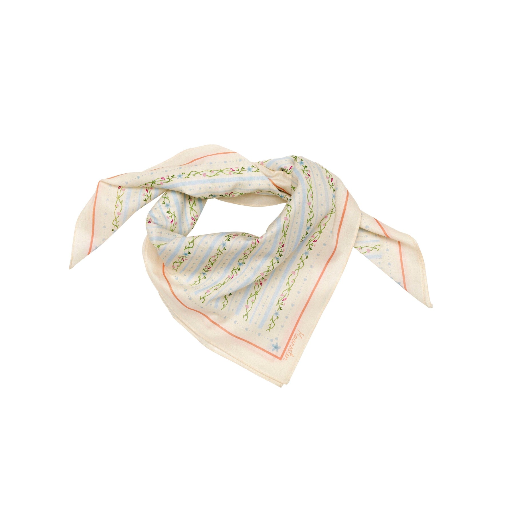 Tørklæde fra Maanesten med lyseblå striber og blomsterprint. Tørklædet har en cremefarvet bund med lyseblå striber og blomsterdetaljer i grønt og lyserødt.