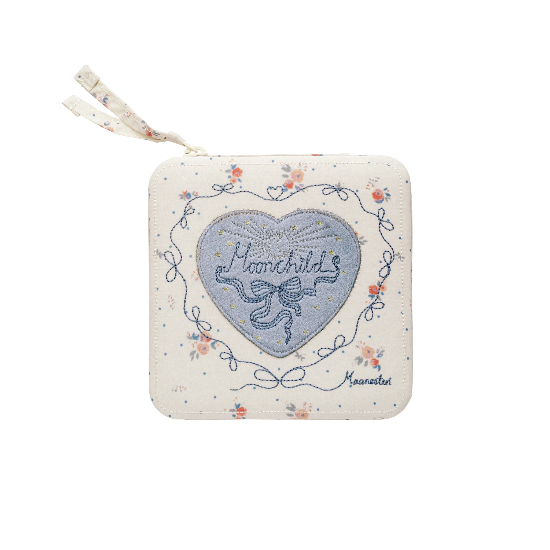 Lyseblåt smykkeskrin fra Maanesten med broderet hjerte på forsiden. Skrinet har en hvid base med små blomstermotiver og blå sløjfedetaljer langs kanten.