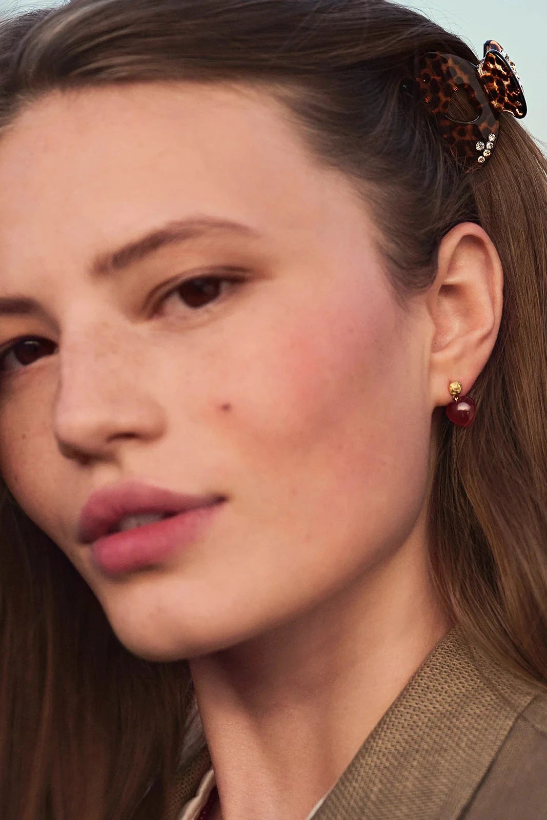 Hårklemme fra Maanesten med leopardmønster i sort og brun. Klemmen har et hjerteformet udsnit og små stenlignende detaljer.
