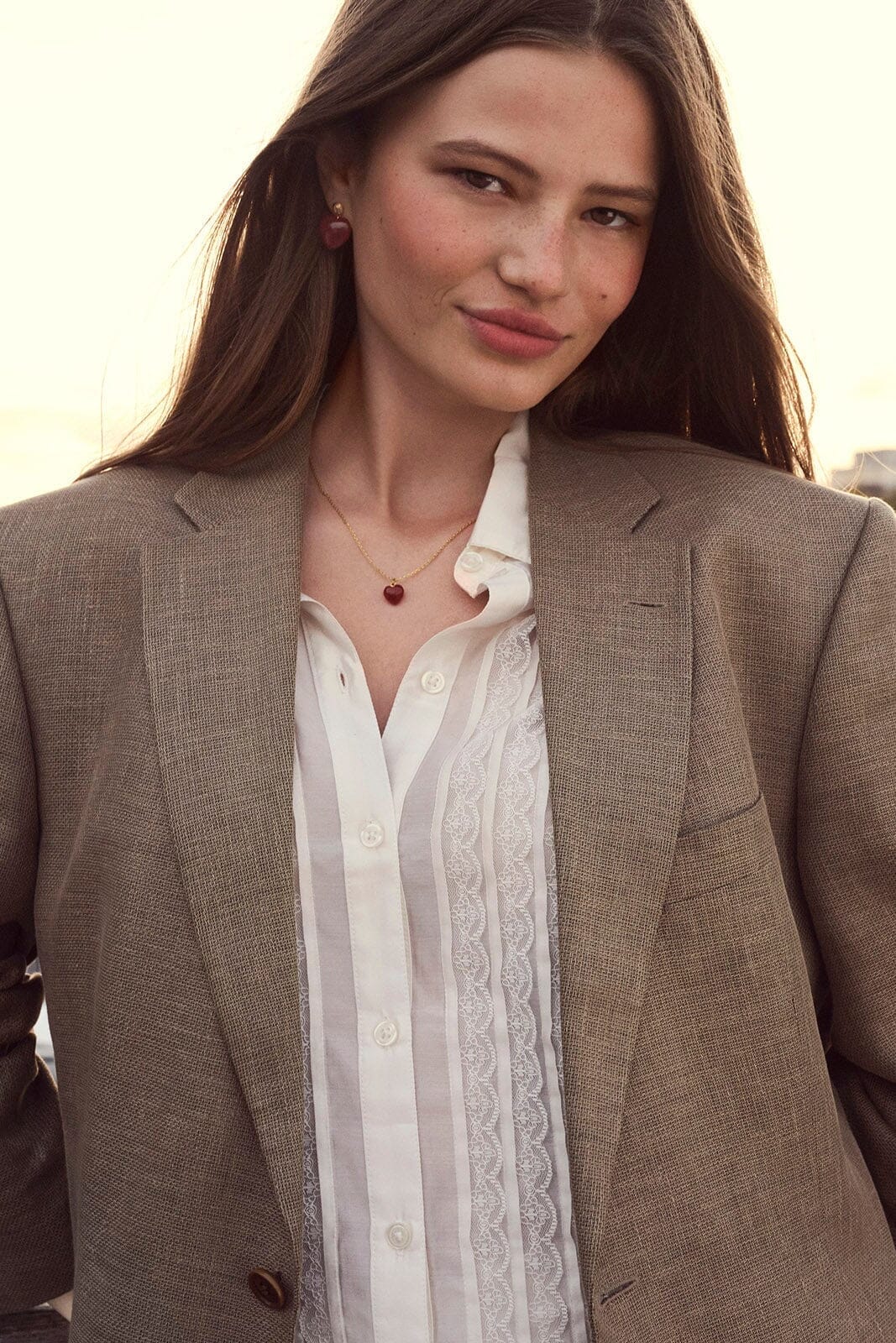 Halskæde fra Maanesten med et hjerteformet vedhæng i dyb rød farve. Fremstillet af genanvendt sterlingsølv belagt med 18 karat guld. Kæden har små led og er designet til at sidde tæt på kroppen.