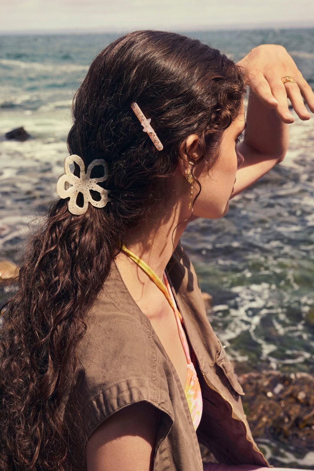 Hårklemme fra Maanesten med et blomstret mønster i gennemsigtig acetat. Designet har udskårne mønstre og små glitrende sten.