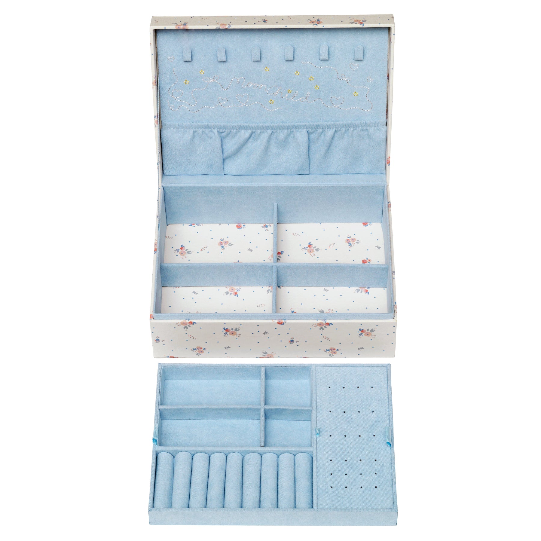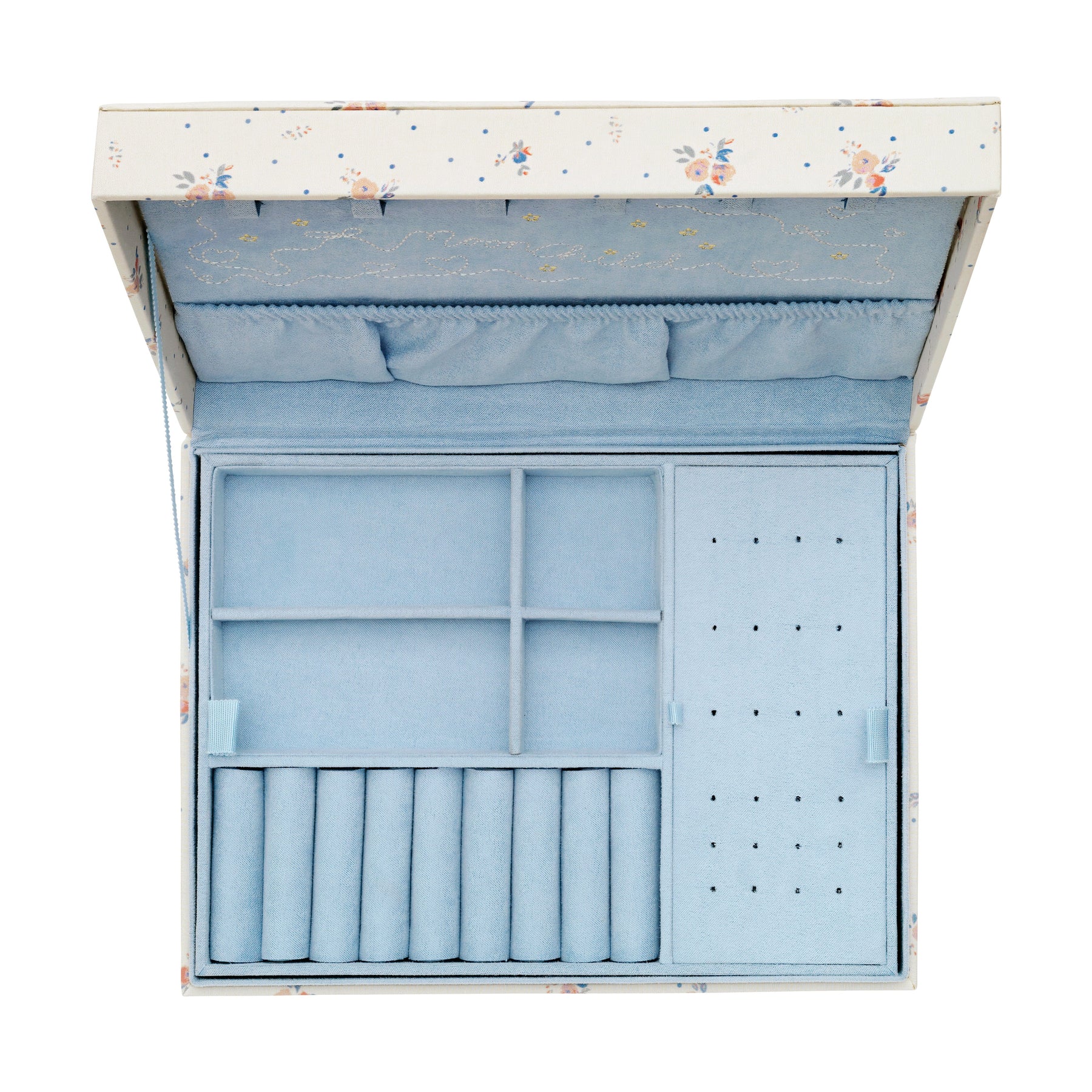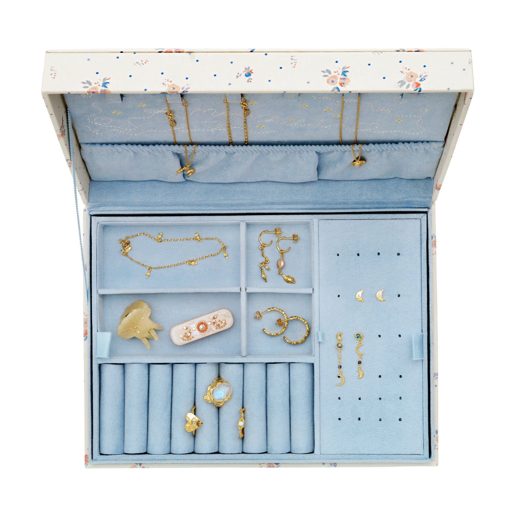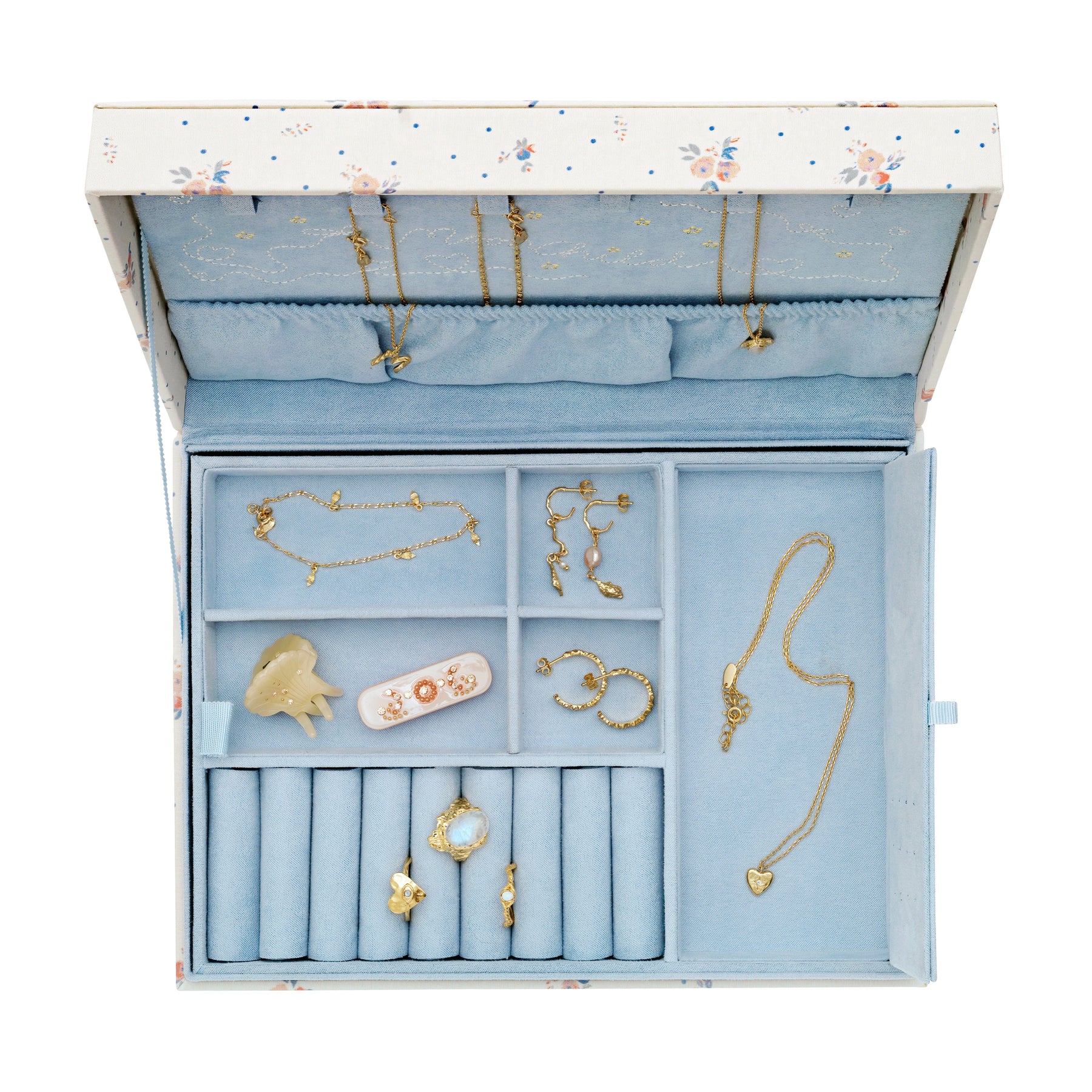 Lyseblåt smykkeskrin fra Maanesten med blomstermønster og hjerteformet detalje på låget. Skrinet har flere rum til opbevaring og en praktisk størrelse til smykkesamlingen.