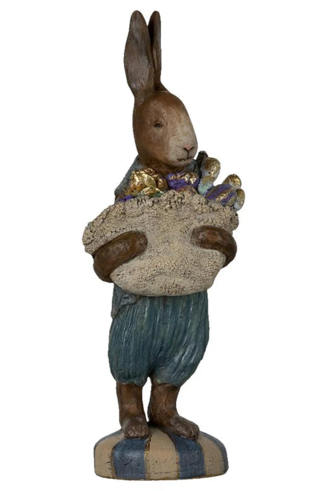 Påskefigur fra Maileg, der forestiller en hare med en kurv fyldt med æg. Figuren har blå og brune nuancer og står på en stribet base.
