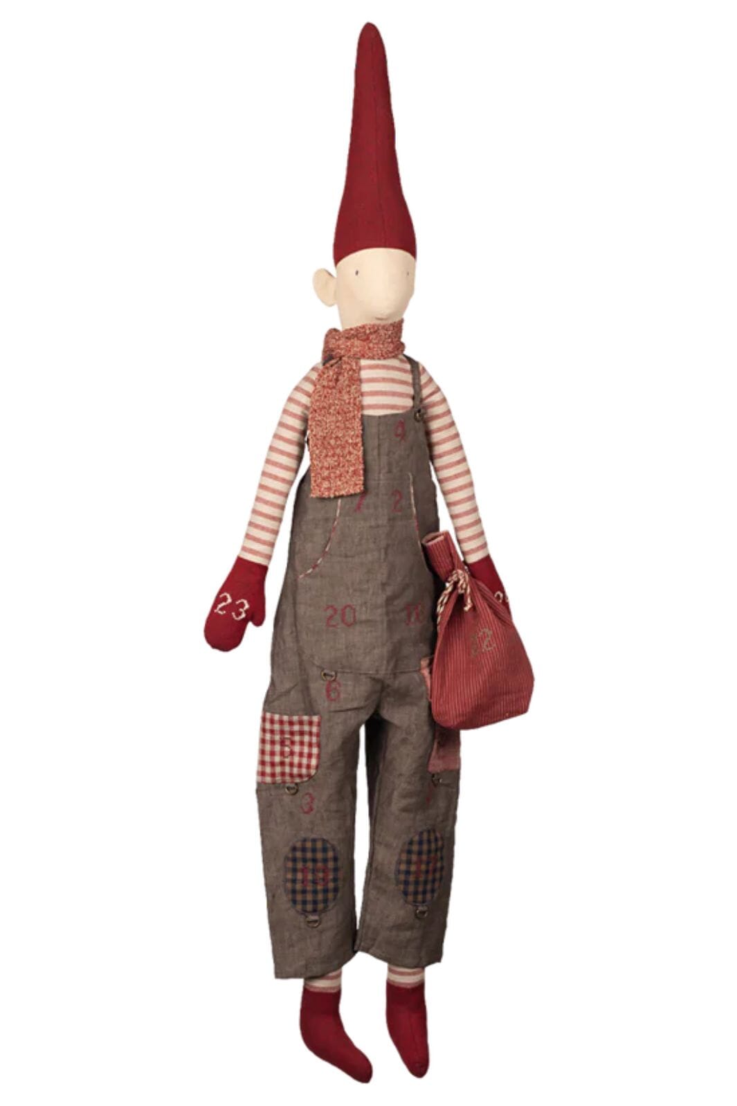 Grå kalendernisse fra Maileg med stribet trøje og overalls med tal. Den 121 cm høje nisse har en rød hue og kan hænges op med stroppen i nakken.
