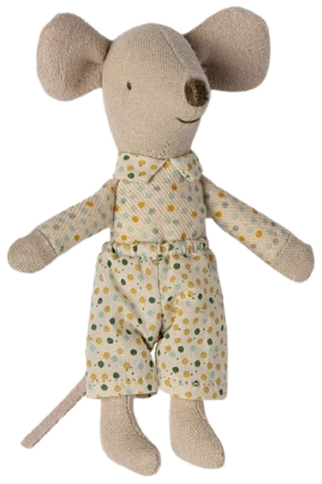Beige stofmus fra Maileg i en vintage-inspireret tændstikæske. Musen har tøj med prikker og kommer med en lille pude og et tæppe i æsken.
