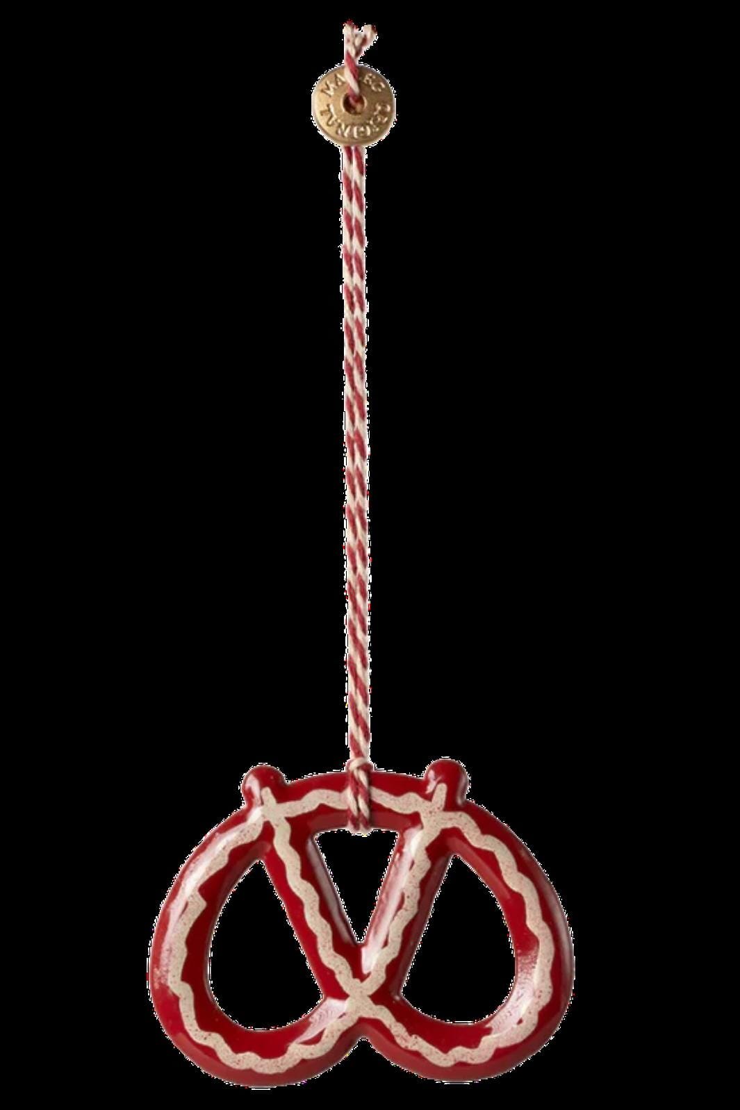 Metalophæng fra Maileg i kringleform med røde og hvide striber. Lavet af metal med håndmalede detaljer og et snoet ophæng.