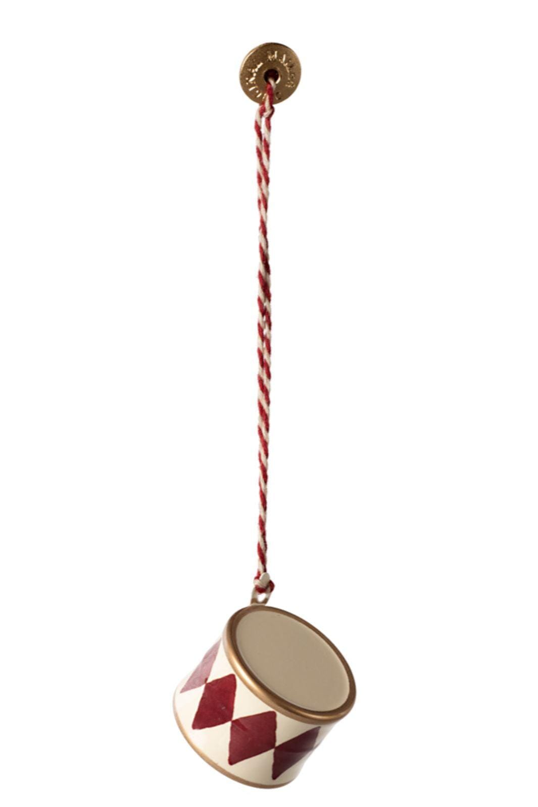 Lille metalophæng i trommeform fra Maileg med rødt og hvidt diamantmønster. Lavet af metal med håndmalede detaljer og snoet ophængssnor.