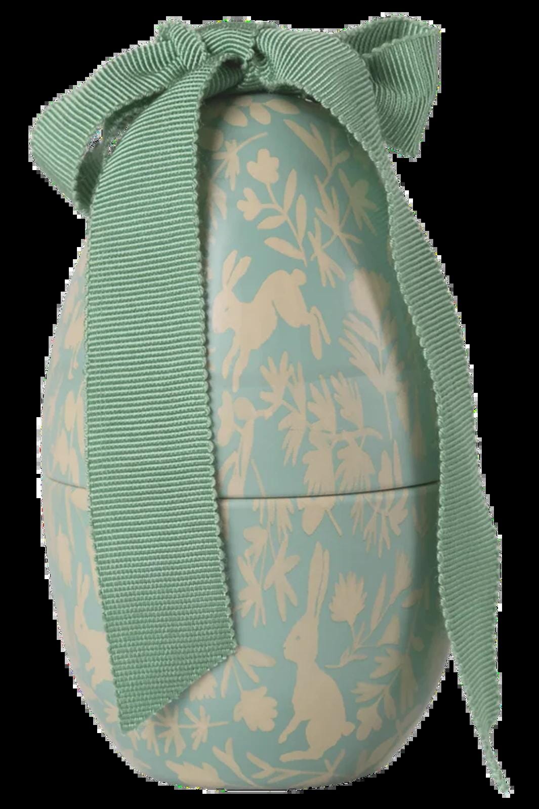Påskeæg fra Maileg i mintgrøn med kaninmønster og grøn sløjfe. Ægget er lavet af metal og fungerer som påskedekoration til vindueskarmen eller hylderne.