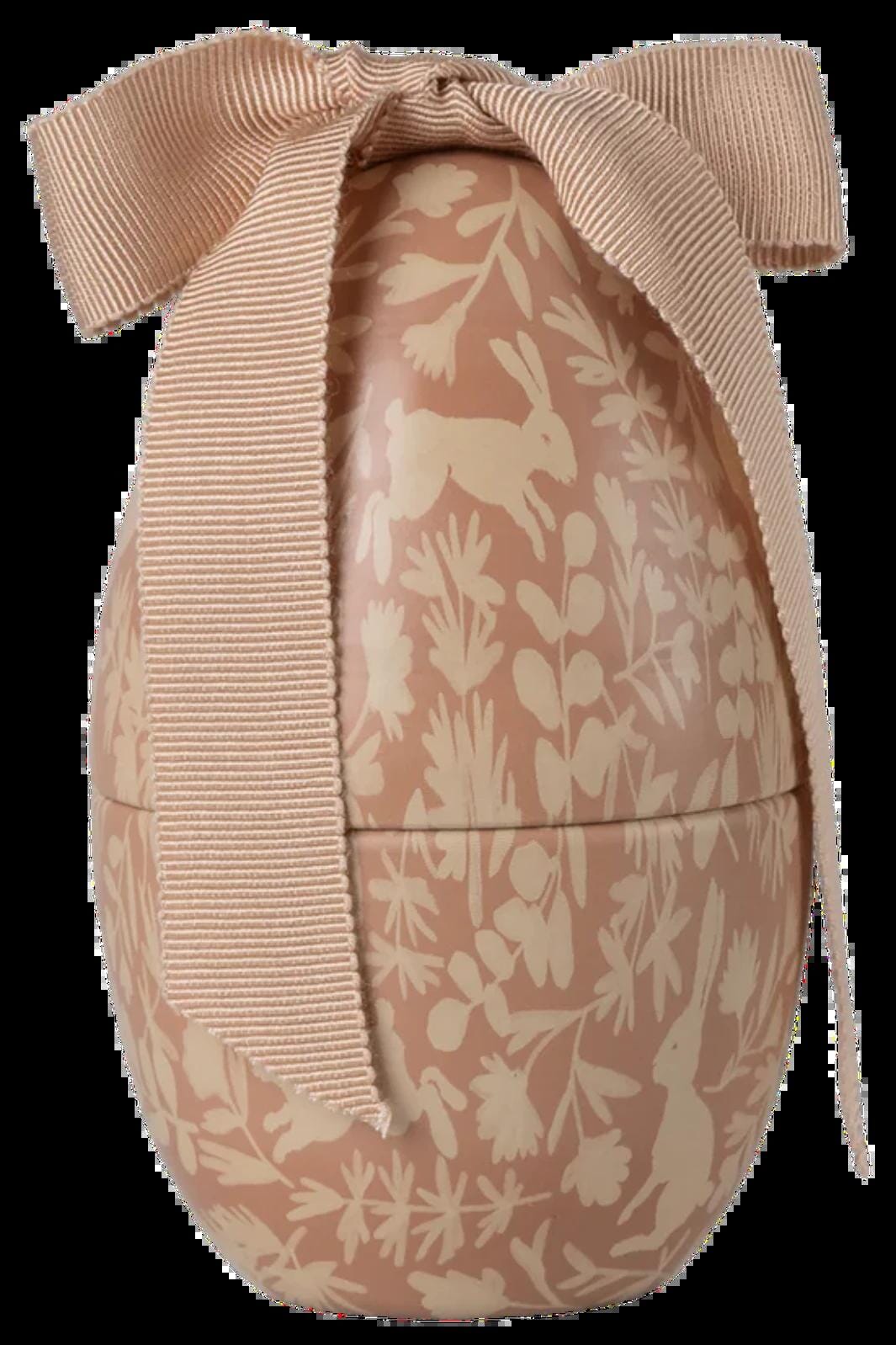 Påskeæg fra Maileg i pink metal med mønster af kaniner og planter. Ægget har en stor sløjfe på toppen og passer ind i en påskeudsmykning.