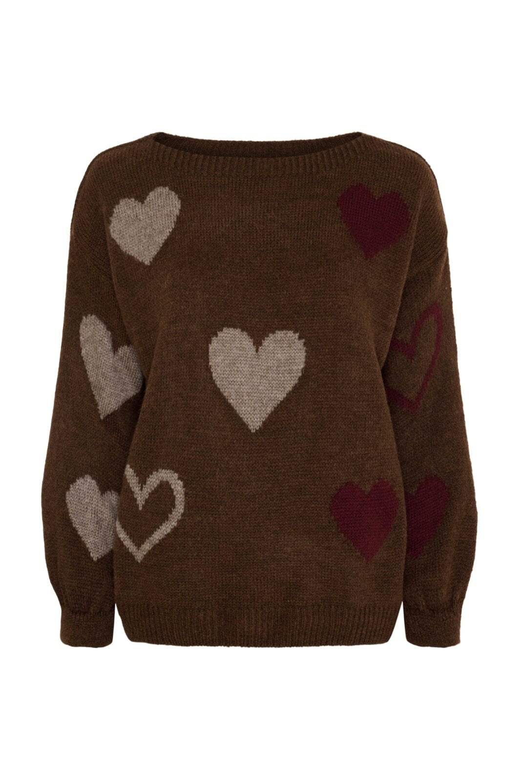 Brun strik fra Marta Du Chateau med hjerteformede mønstre på forsiden i grå og bordeaux. Bagsiden er ensfarvet brun uden mønstre.