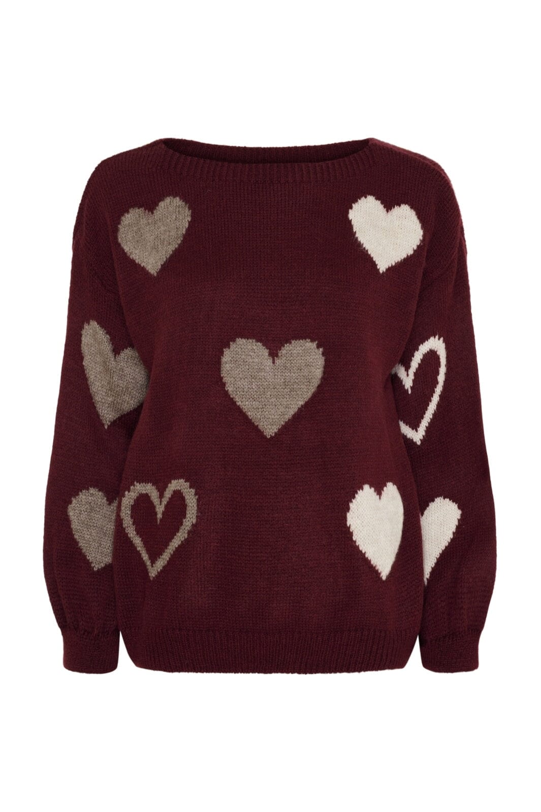Vinrød strik fra Marta Du Chateau med hjerteformede mønstre i forskellige nuancer. Strikken har en rund hals og lange ærmer.