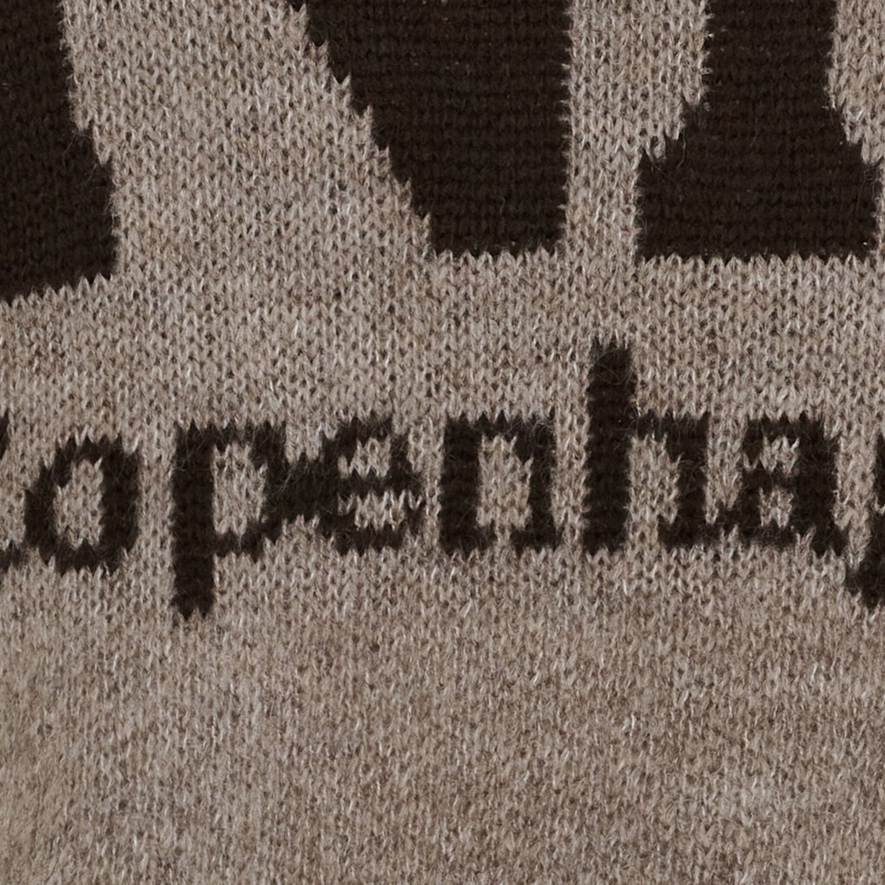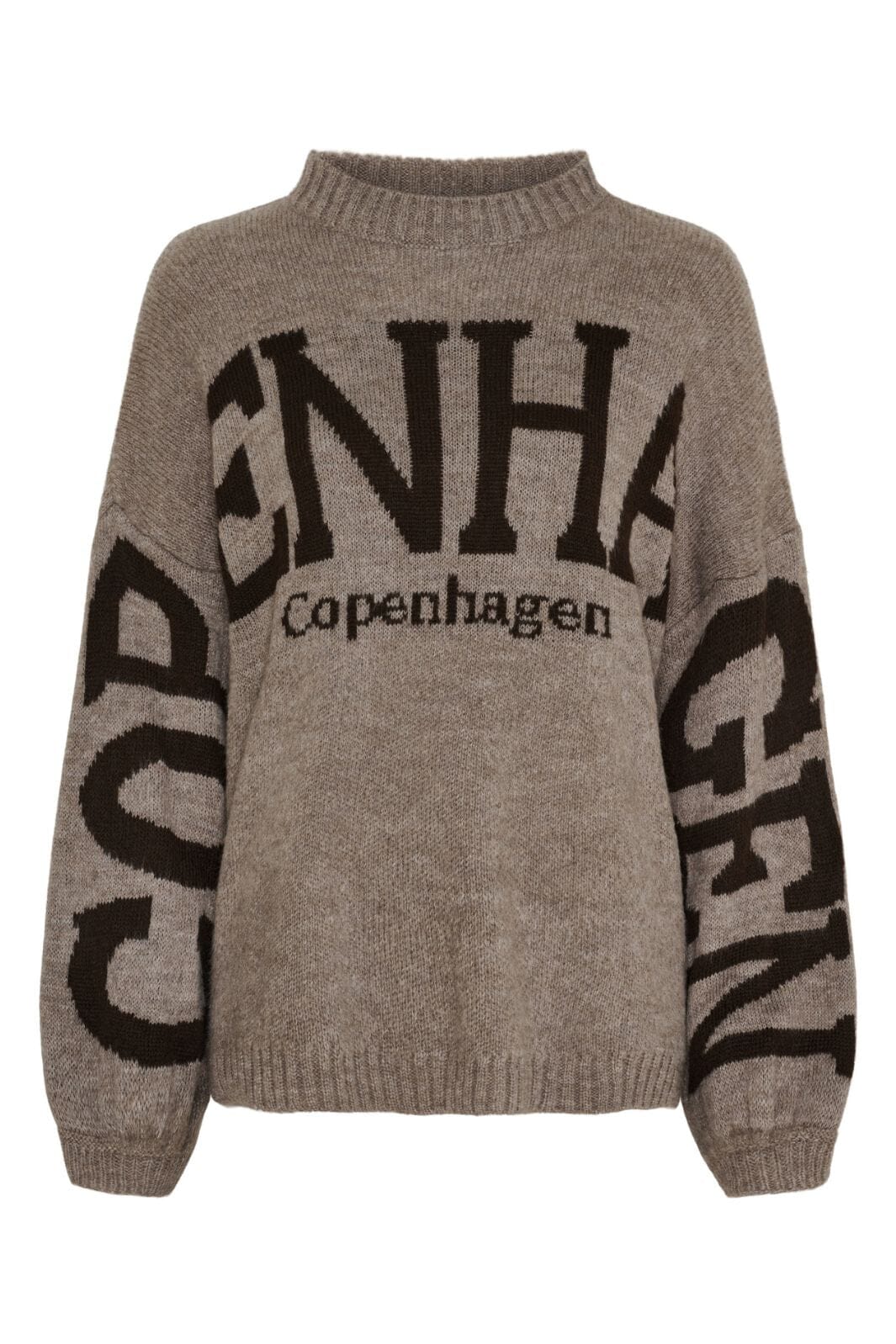 Striktrøje fra Marta Du Chateau i en mørk brun nuance med stort Copenhagen-print på forsiden og ærmerne. Strikken har en oversized pasform og en rund halsudskæring.