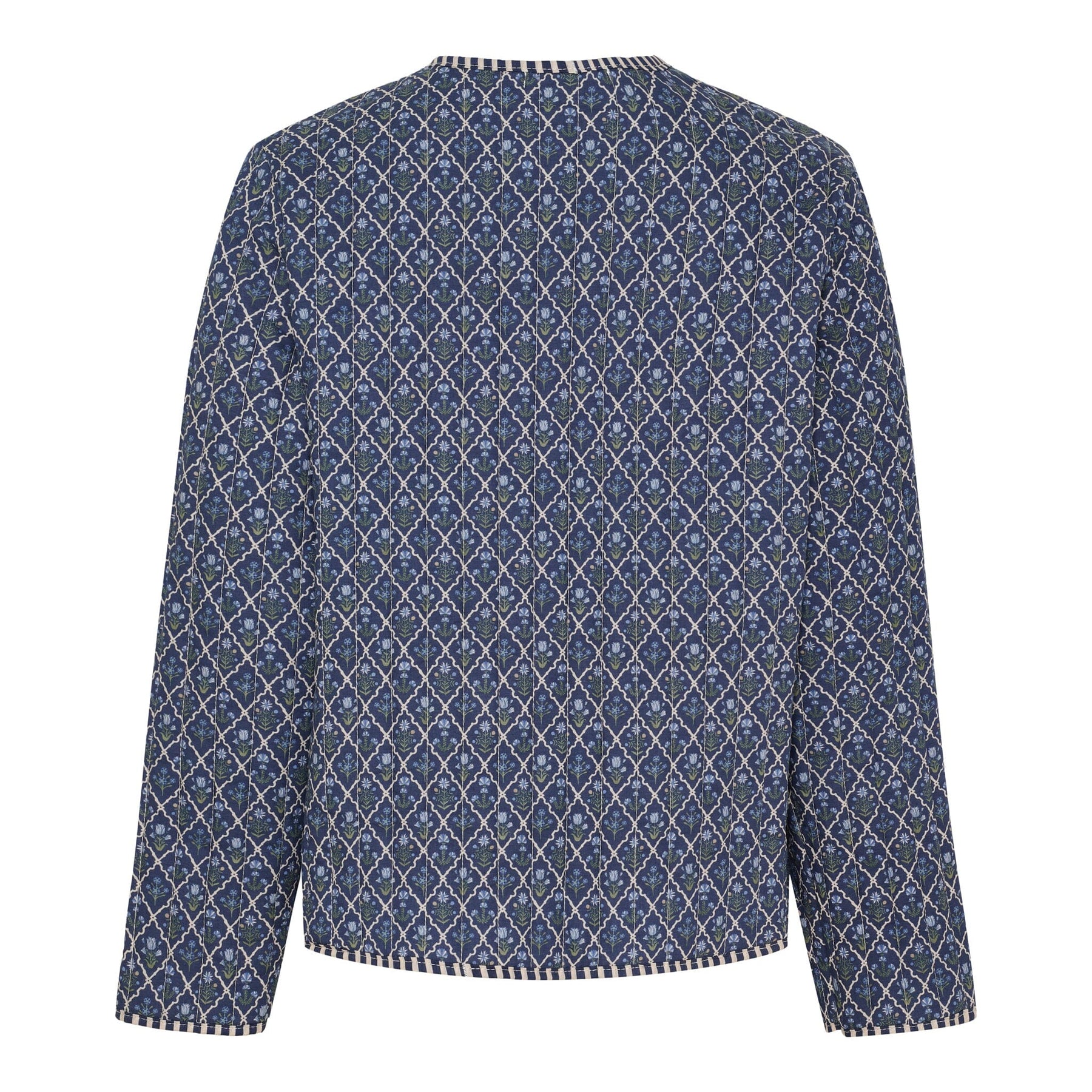 Mørkeblå jakke fra Marta Du Chateau med rudemønster og dekorative syninger. Den har rund halsudskæring, knaplukning foran og to praktiske forlommer med kontrastmønster.