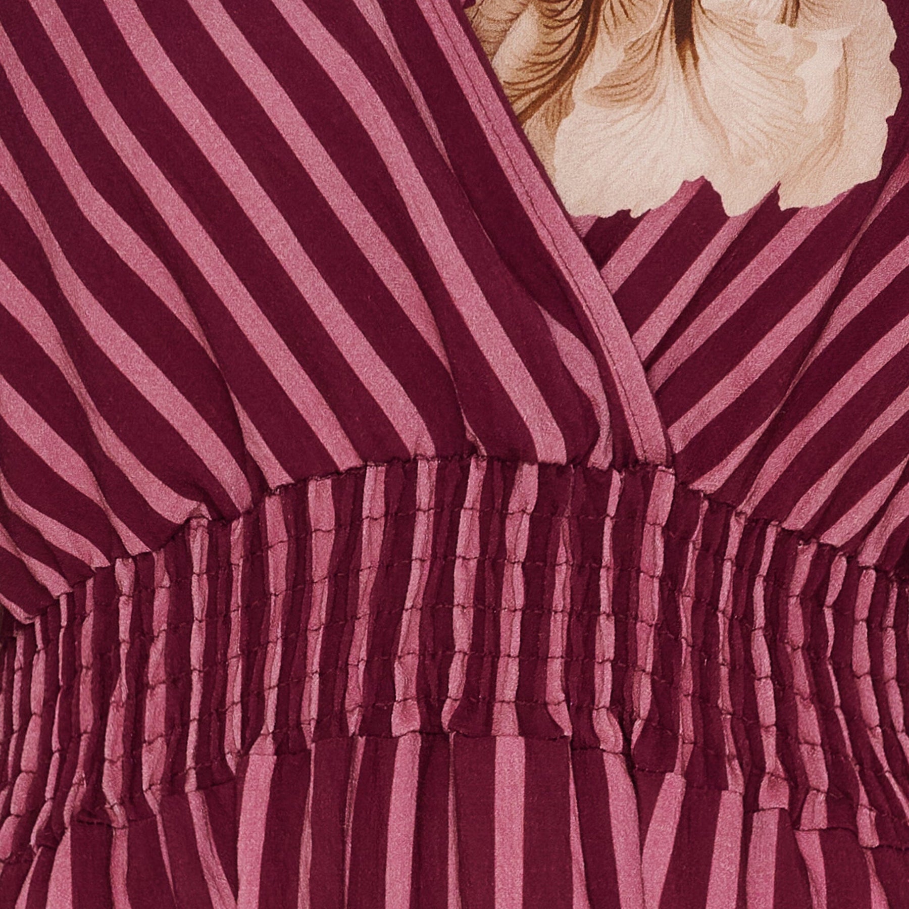 Knælang kjole fra Marta Du Chateau i bordeaux med blomstermønster og lodrette striber. Den har V-udskæring, elastik i taljen og lange ærmer med elastik ved håndleddene.